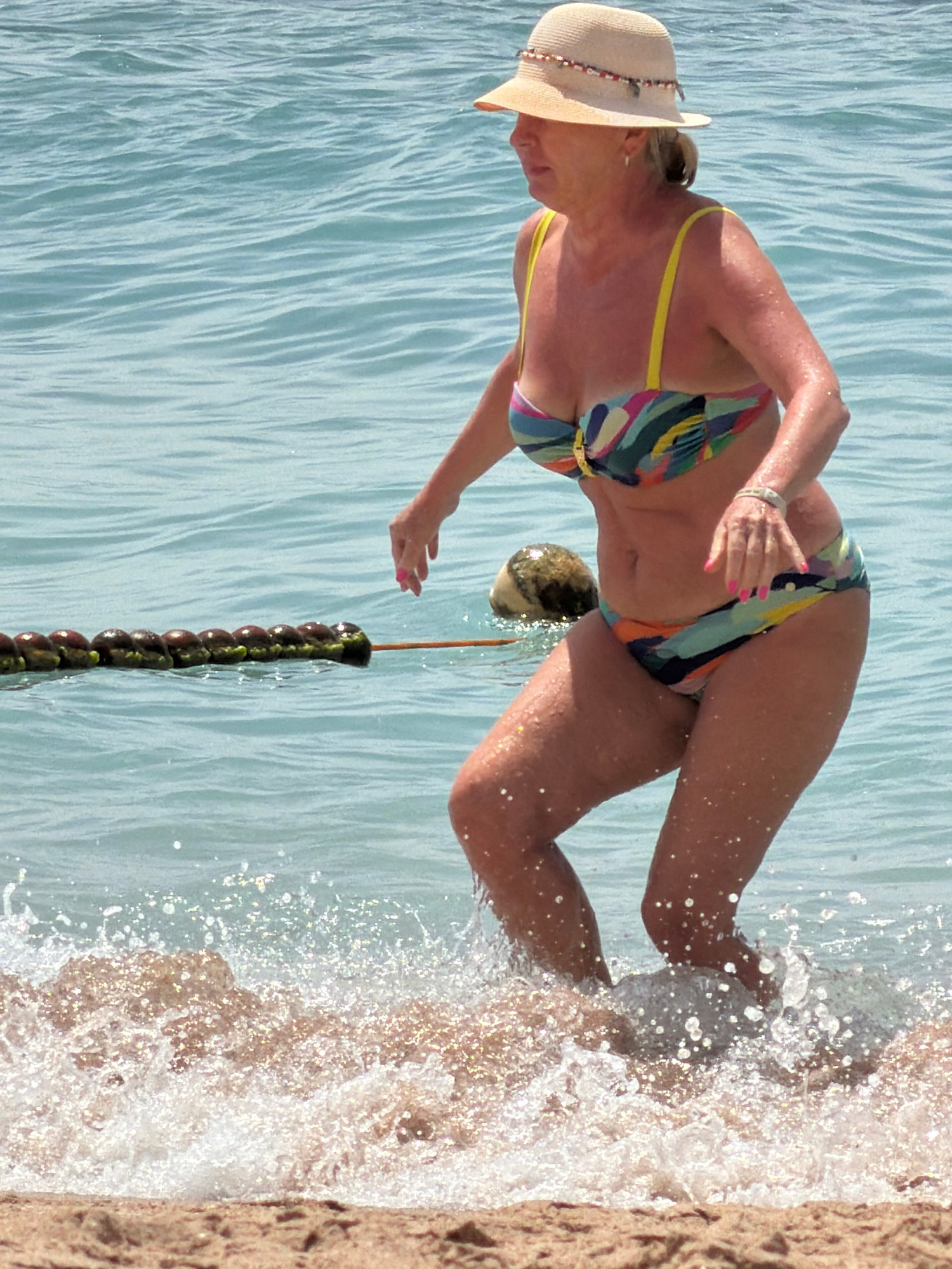 An outdoor, sunlit photograph captures a woman standing at the edge of the sea in Sharm El Sheikh, Egypt. She is seen from the waist up, slightly turned away from the camera, looking downwards. She we…read more