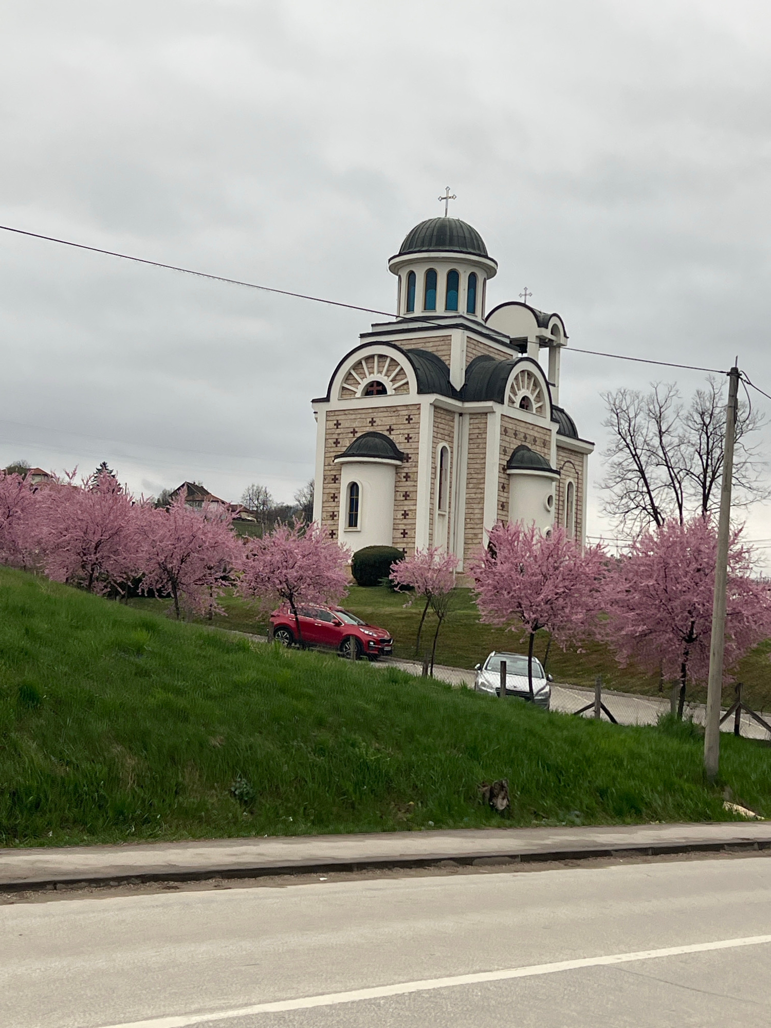 The image shows a church in Cacak, Serbia, with a distinct architectural style featuring domes and decorative brickwork. The church is surrounded by blooming trees with pink blossoms, suggesting it is…read more