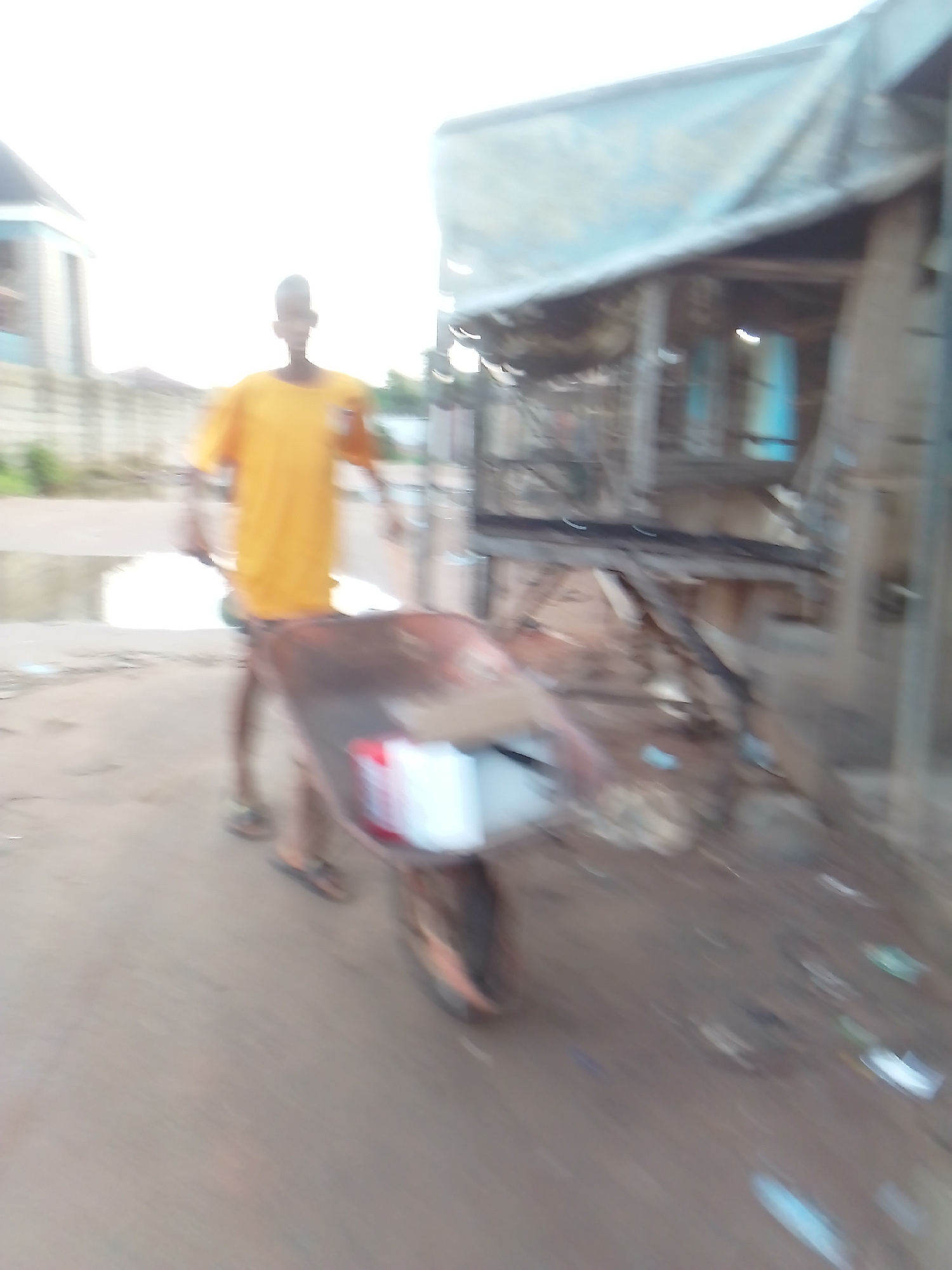 A blurry image shows a person in a yellow shirt pushing a wheelbarrow on what appears to be a street. There is debris scattered on the ground. Behind the person and wheelbarrow is a makeshift structur…read more