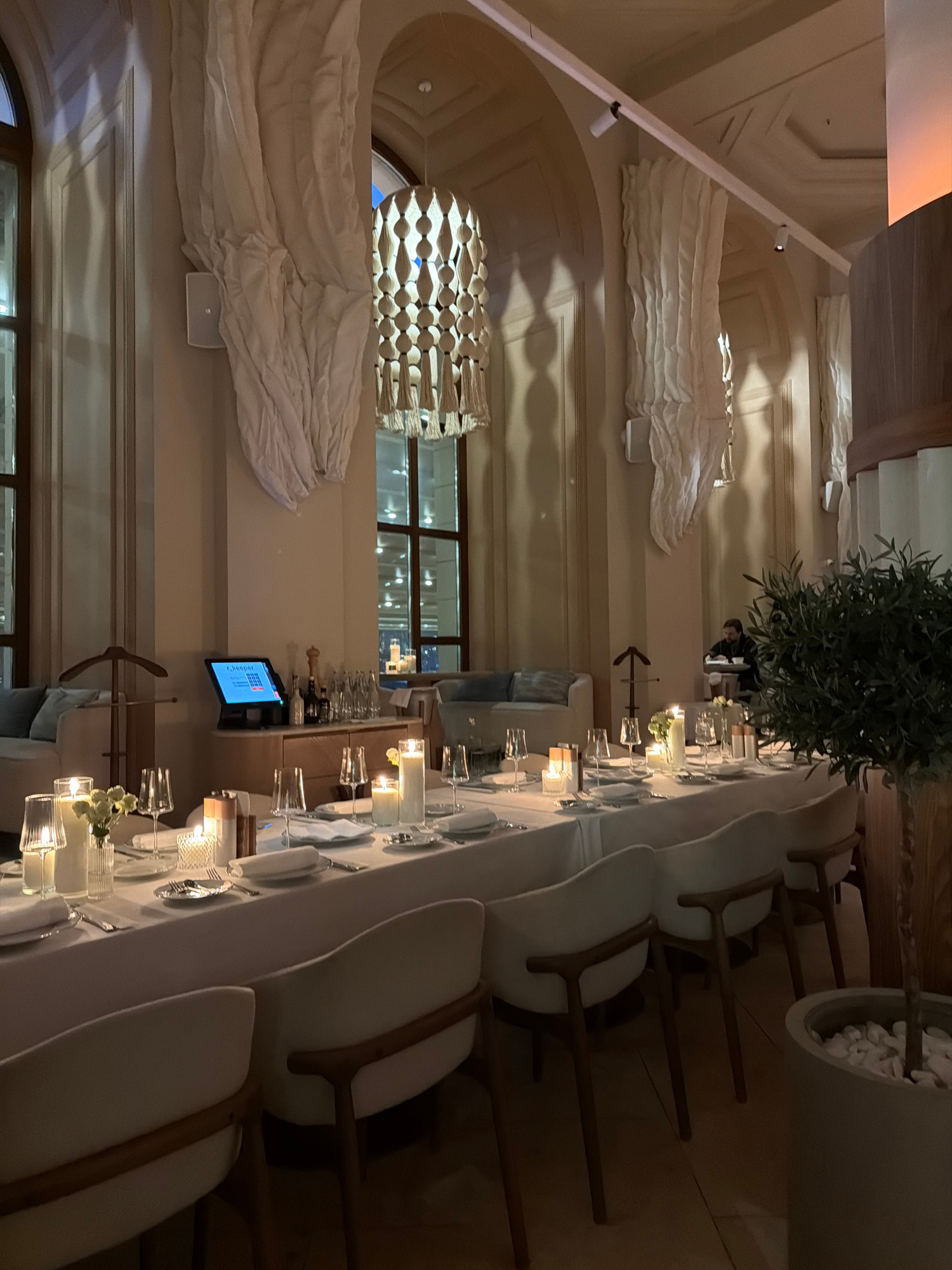 The image shows the interior of a restaurant, likely in Moscow, Russia, set up for a private event. The long table is covered with a white tablecloth and set with glassware, plates, silverware, and sm…read more