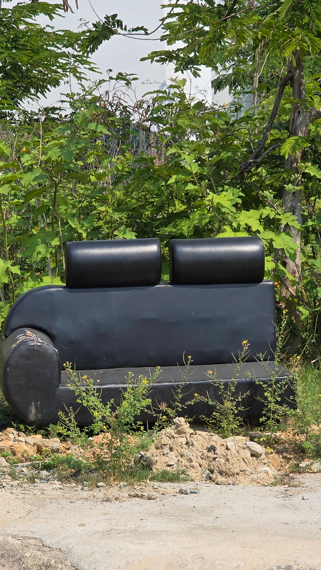A black, modern-style sofa sits outdoors in Bắc Nha Trang, Vietnam. The sofa, featuring two cylindrical back cushions and a rounded end, is positioned on a patch of dirt and gravel alongside a concret…read more