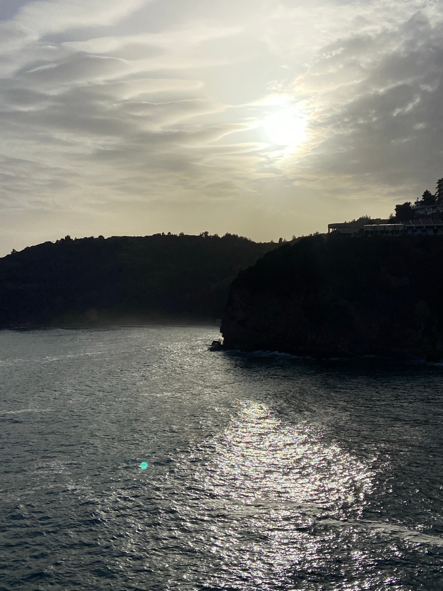The image depicts a coastline with a dark, steep hillside meeting the sea. The sky is overcast with a bright sun partially obscured by clouds. In the foreground, the water surface is reflective and sh…read more