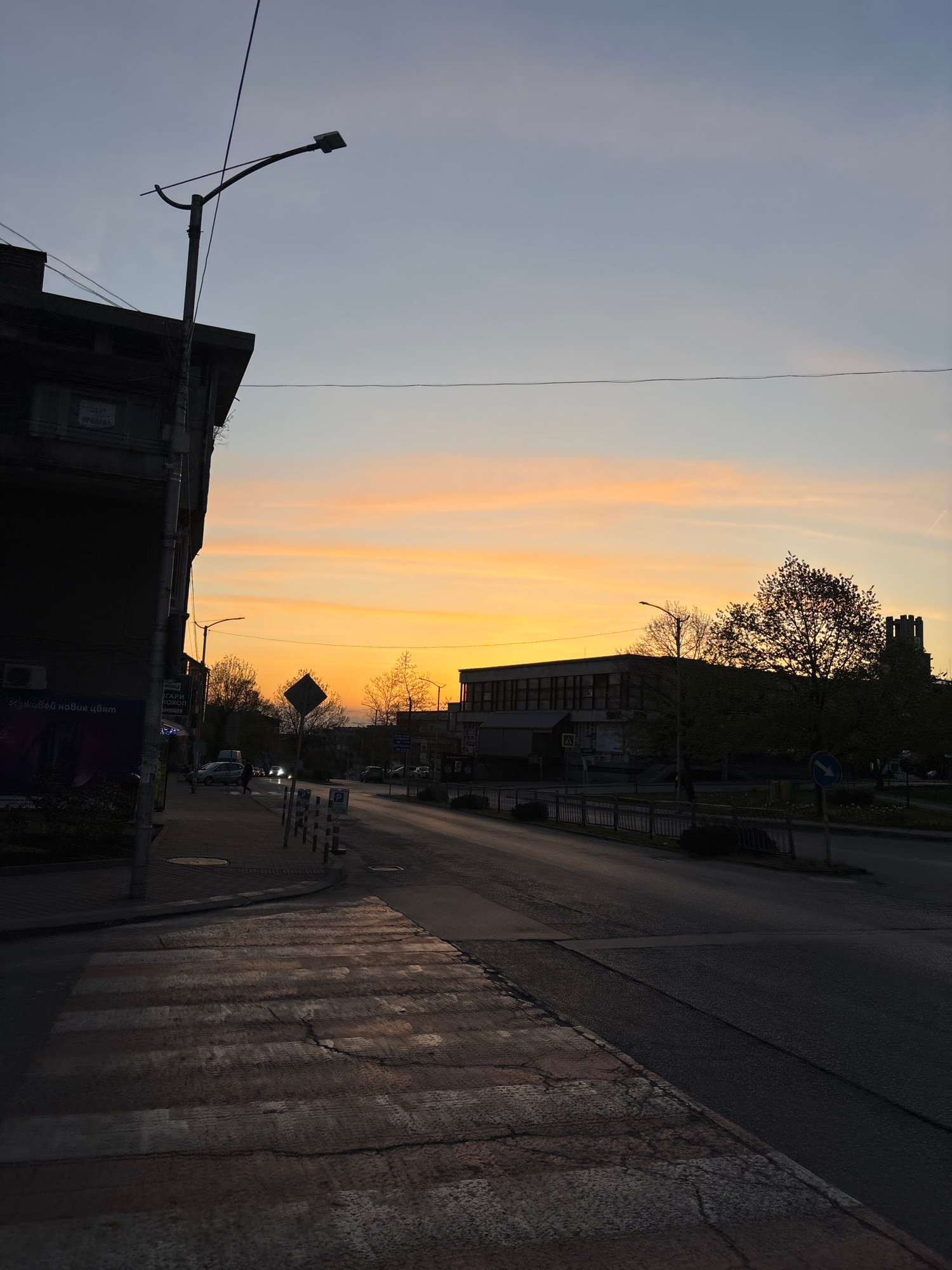 The image depicts a street scene in Chirpan, Bulgaria, at dusk. The sky is a gradient of light blue to orange, indicating the setting sun. A street lined with buildings and trees runs from the foregro…read more