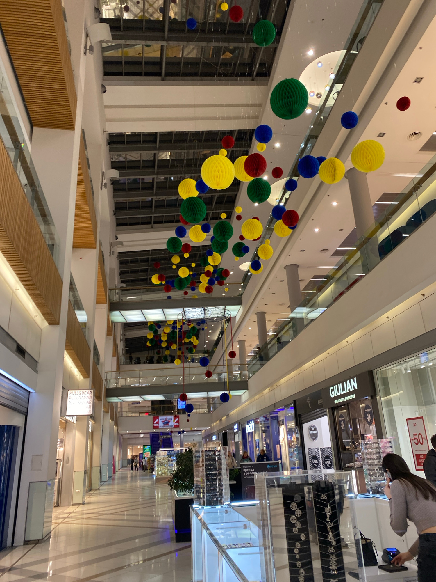 This is an interior view of a bright, multi-story shopping mall or large commercial complex in Varna, Bulgaria. The image captures a wide-angle perspective, looking upwards and along a spacious corrid…read more