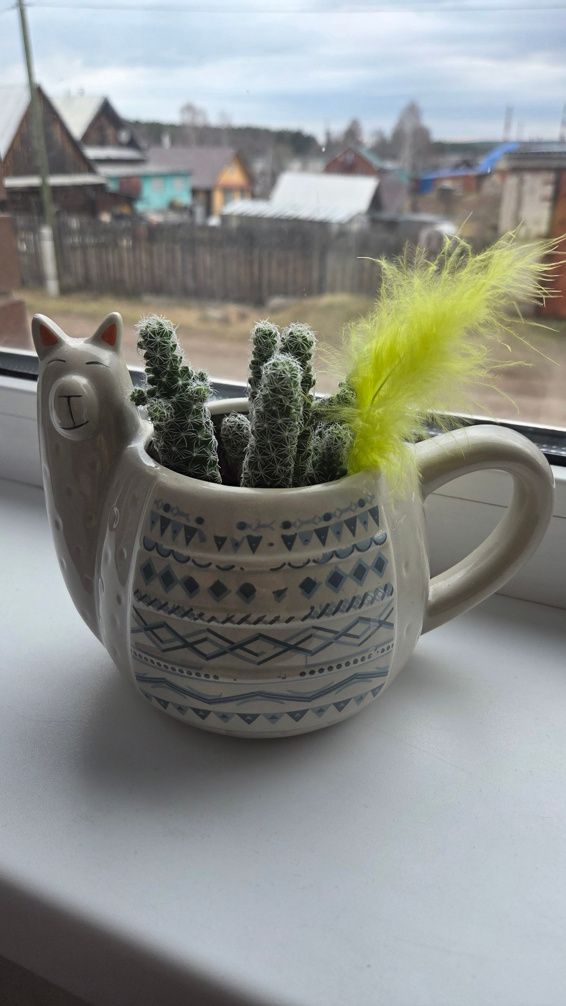 A ceramic mug-shaped planter, designed as a cat with eyes closed in a smiling expression, rests on a white windowsill. Inside the planter, a cactus plant grows alongside a vibrant yellow feather. The…read more