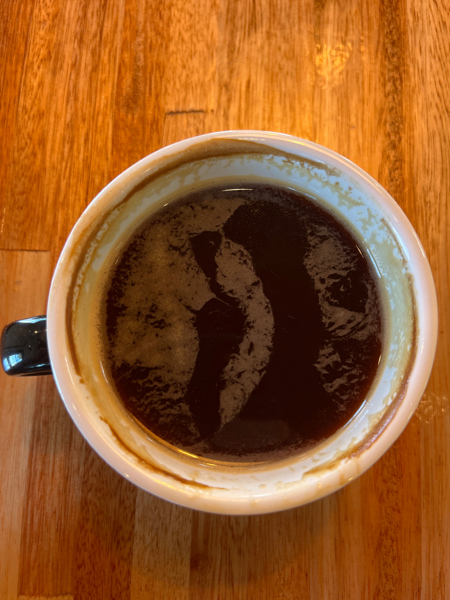 The image shows a top-down view of a white ceramic mug filled with a dark brown liquid, likely coffee, sitting on a wooden surface. The mug has a black handle visible at the bottom. The surface of the…read more
