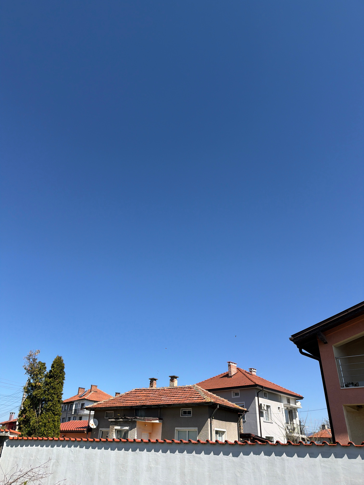 The image shows a view looking up at buildings against a clear blue sky. The buildings are a mix of residential structures, with tiled roofs and varying colors. One building has a red-tiled roof and a…read more