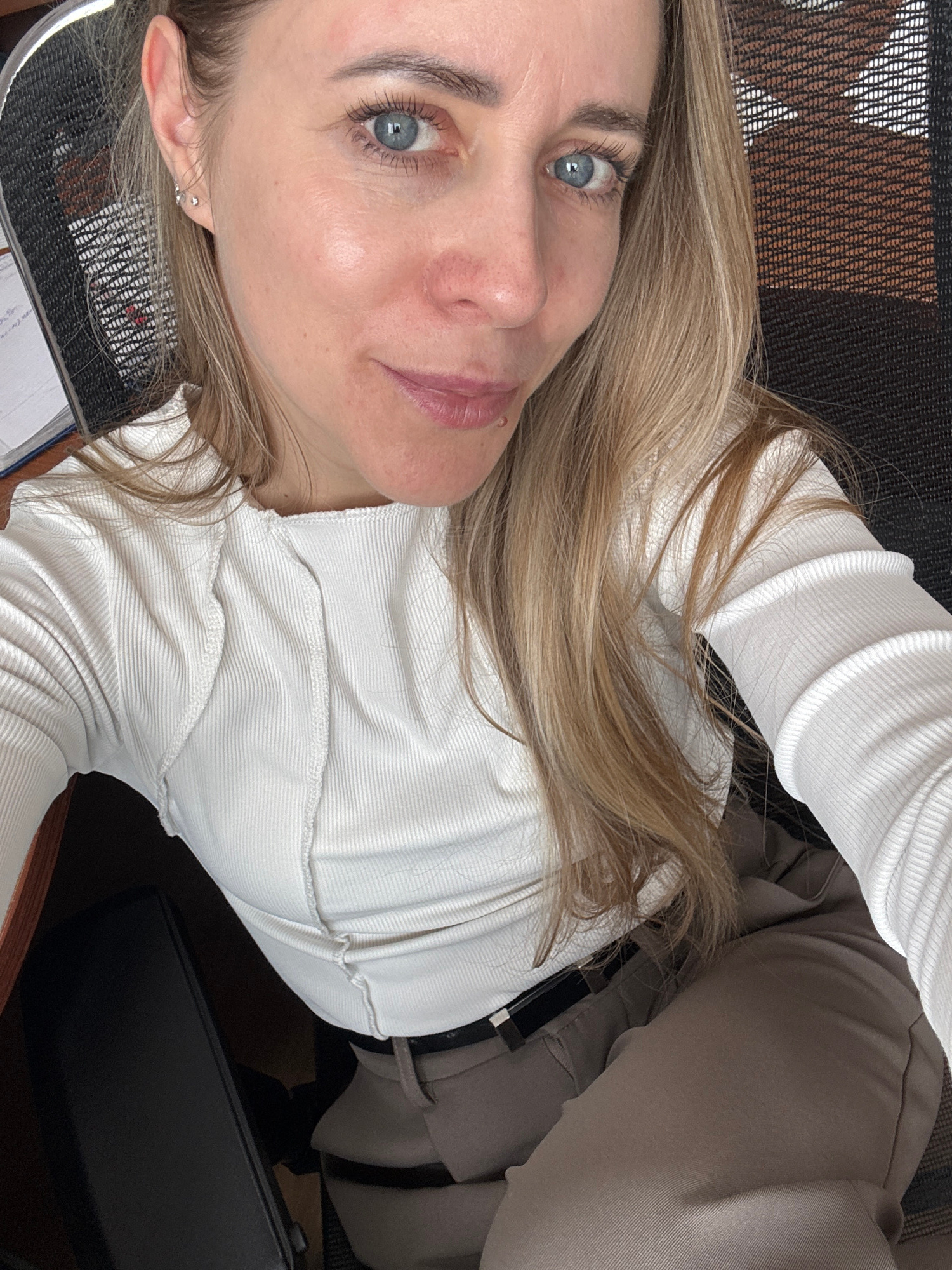 A blonde woman with light blue eyes is looking directly at the camera. She is wearing a white long-sleeved shirt and light brown trousers. The background includes what appears to be an office chair wi…read more