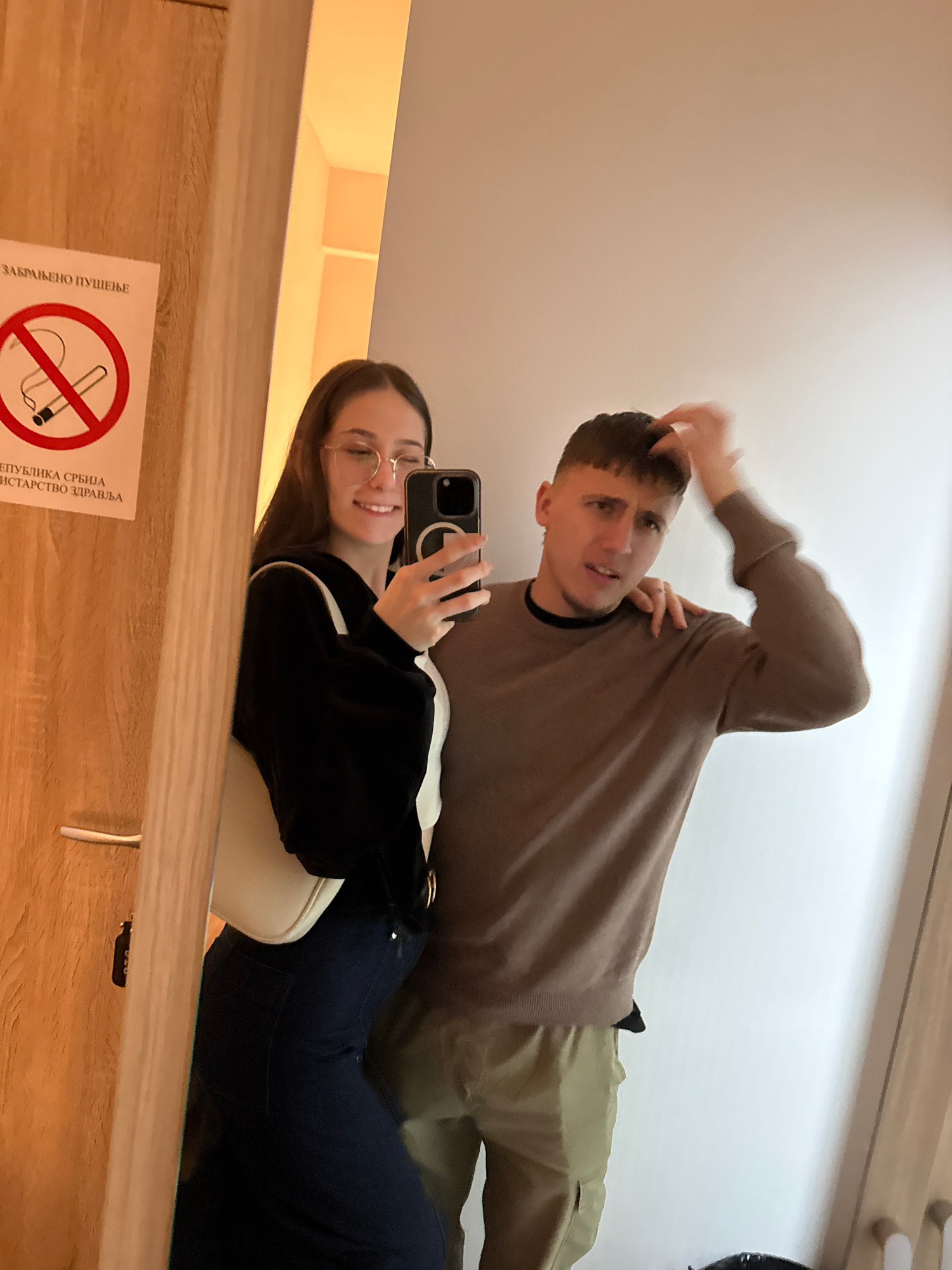 A mirror selfie captures two individuals indoors within the city of Vozdovac Urban Municipality, Serbia. The location is indicated by a visible "ЗАБРАЊЕНО ПУШЕЊЕ" (No Smoking) sign with "РЕПУБЛИКА СРБ…read more
