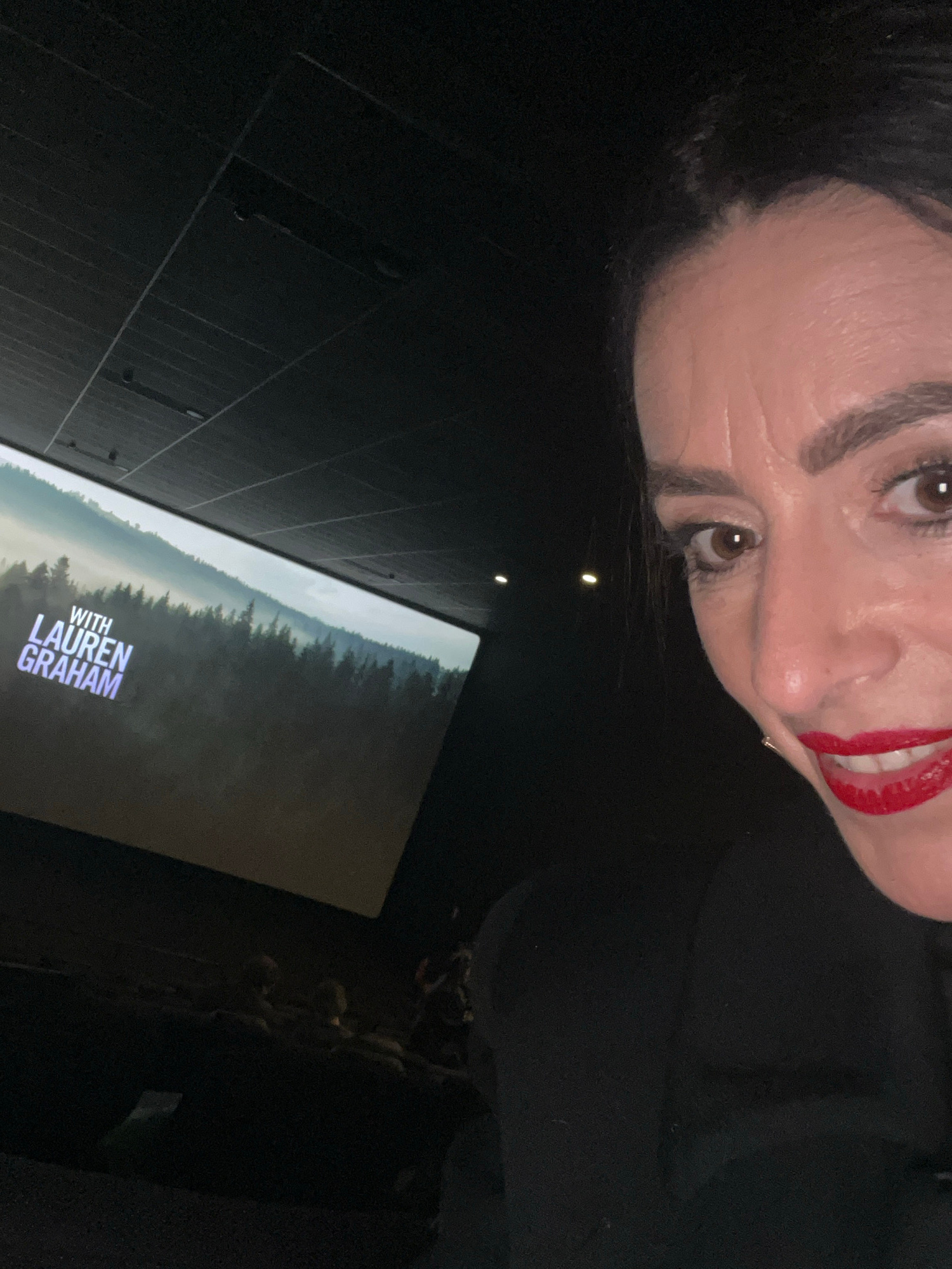 The image is a selfie taken by a woman with dark hair and bright red lipstick. She is looking at the camera with a slight smile. The background appears to be a movie theater or similar venue, given th…read more