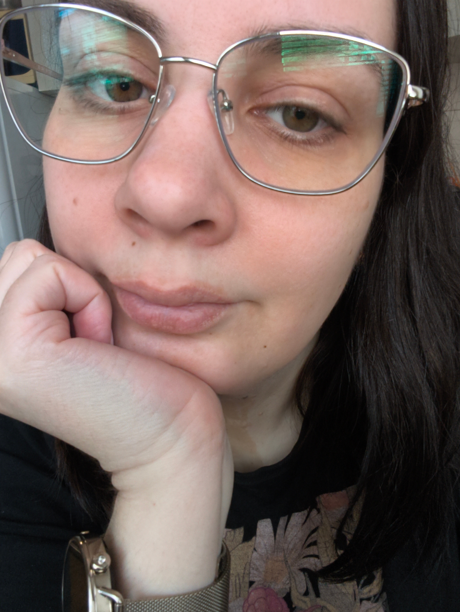 A close-up, chest-up portrait features an individual, likely female, with fair skin, dark hair, and brown eyes, looking towards the viewer. They are wearing silver-framed glasses that have a slightly…read more