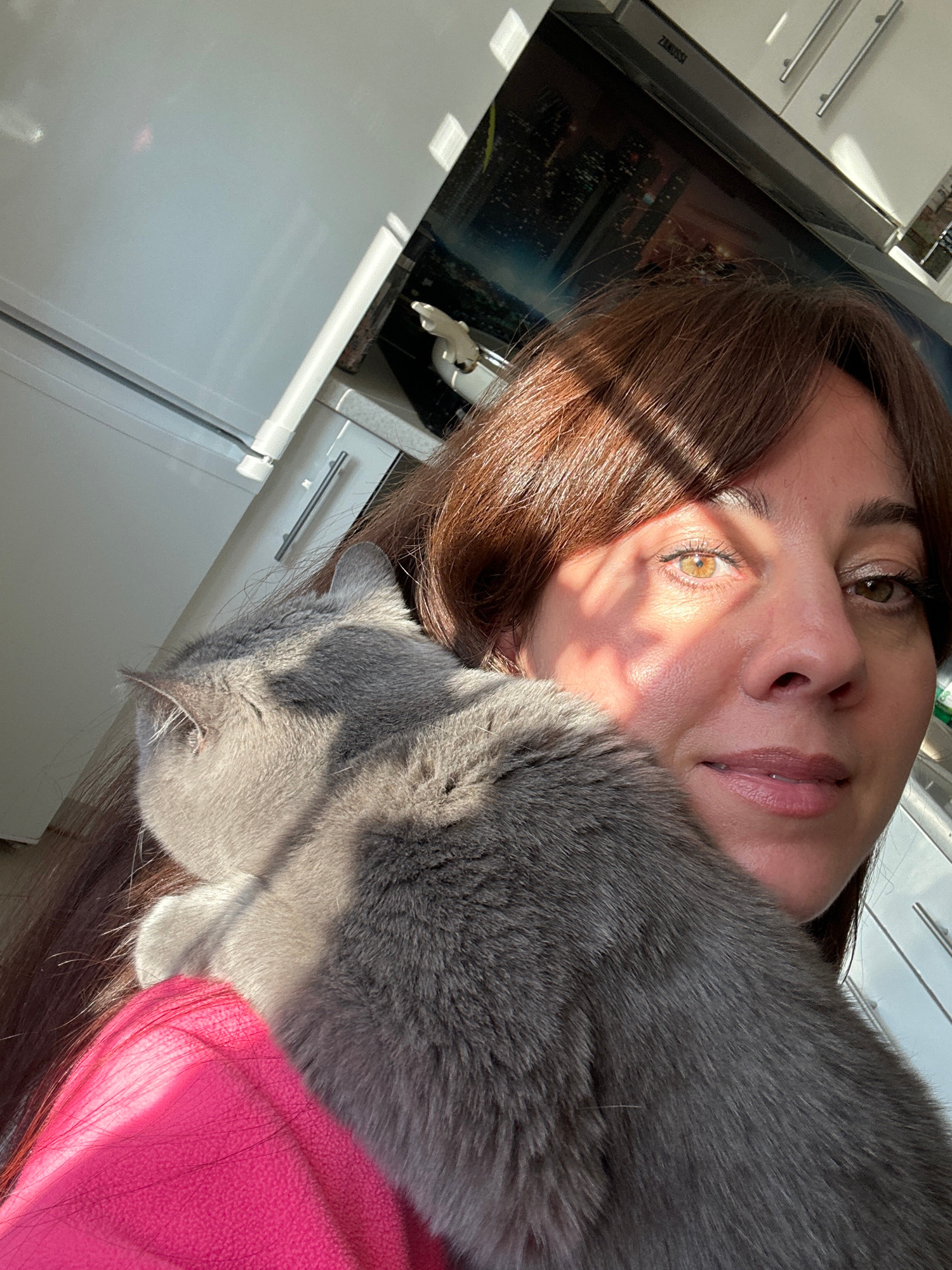 A woman with brown hair is taking a selfie with a gray cat. The cat is resting against her face and shoulder. She is wearing a pink garment. The photo appears to be taken indoors, possibly in a kitche…read more