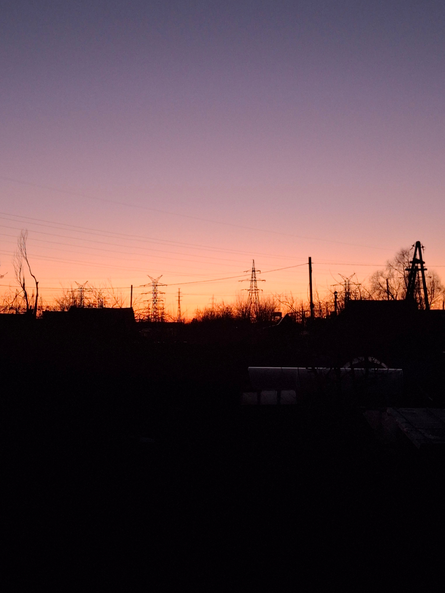 The image captures a sunset in what appears to be the city of Chaikovsky, Russia, as evidenced by the industrial setting and overhead power lines, which are typical of urban and industrial areas. The…read more