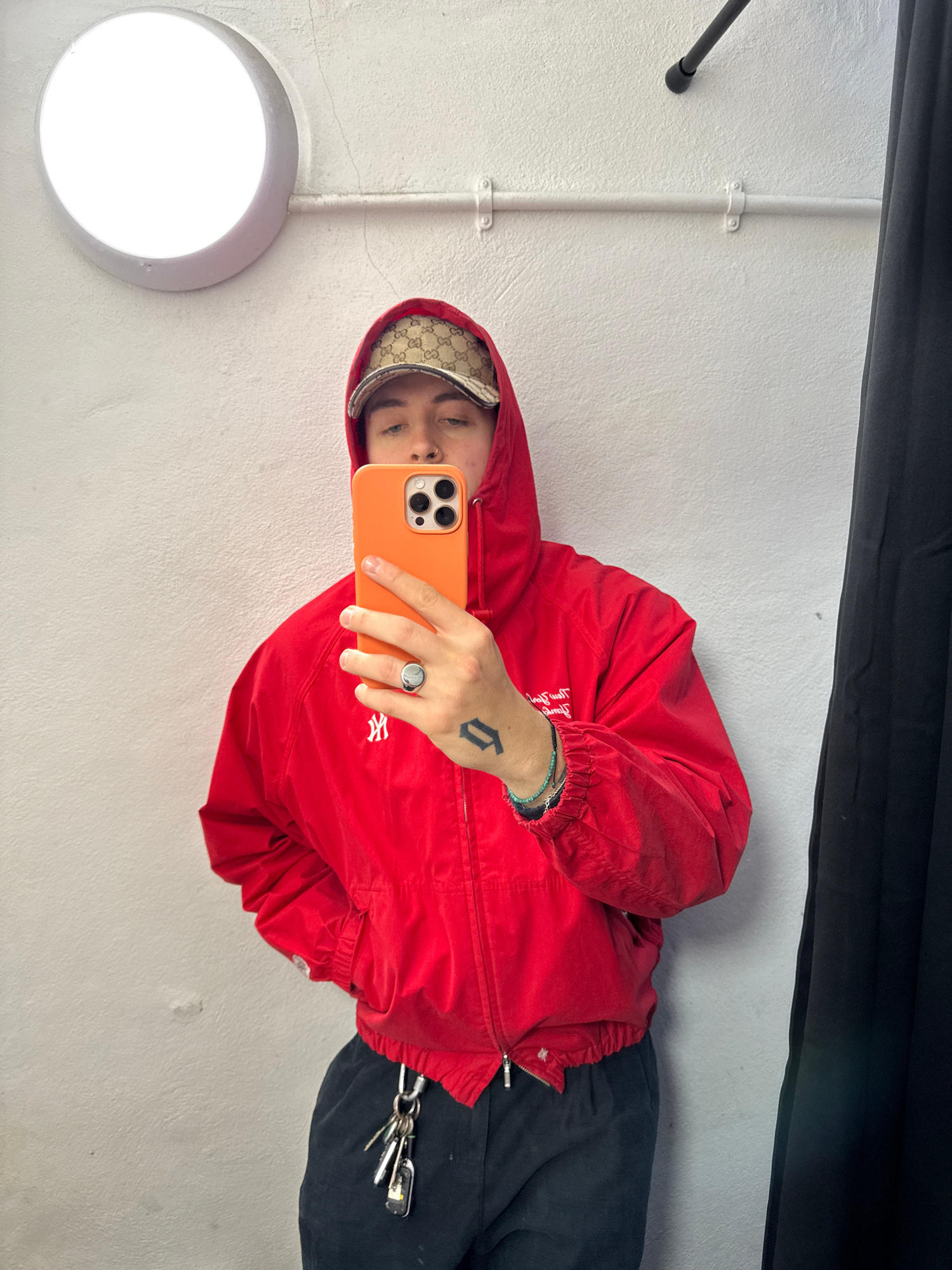 A person is taking a selfie in what appears to be an indoor space, possibly a dressing room or small shop. The person is wearing a red jacket, a patterned cap, and gray pants. They are holding an oran…read more
