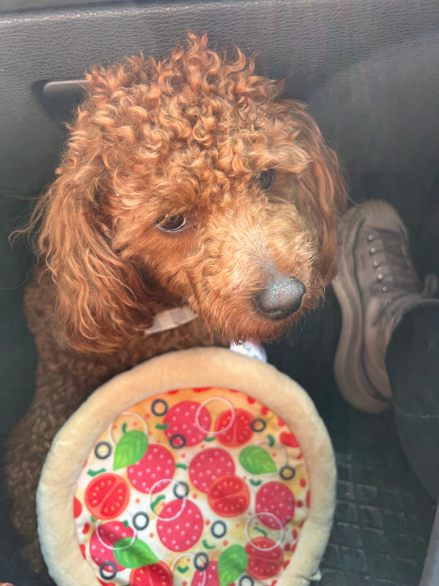 A brown, curly-haired poodle is lying in what appears to be the cargo area of a vehicle. The dog is next to a round, stuffed pizza-shaped dog bed. Part of a grey sneaker is visible in the upper portio…read more