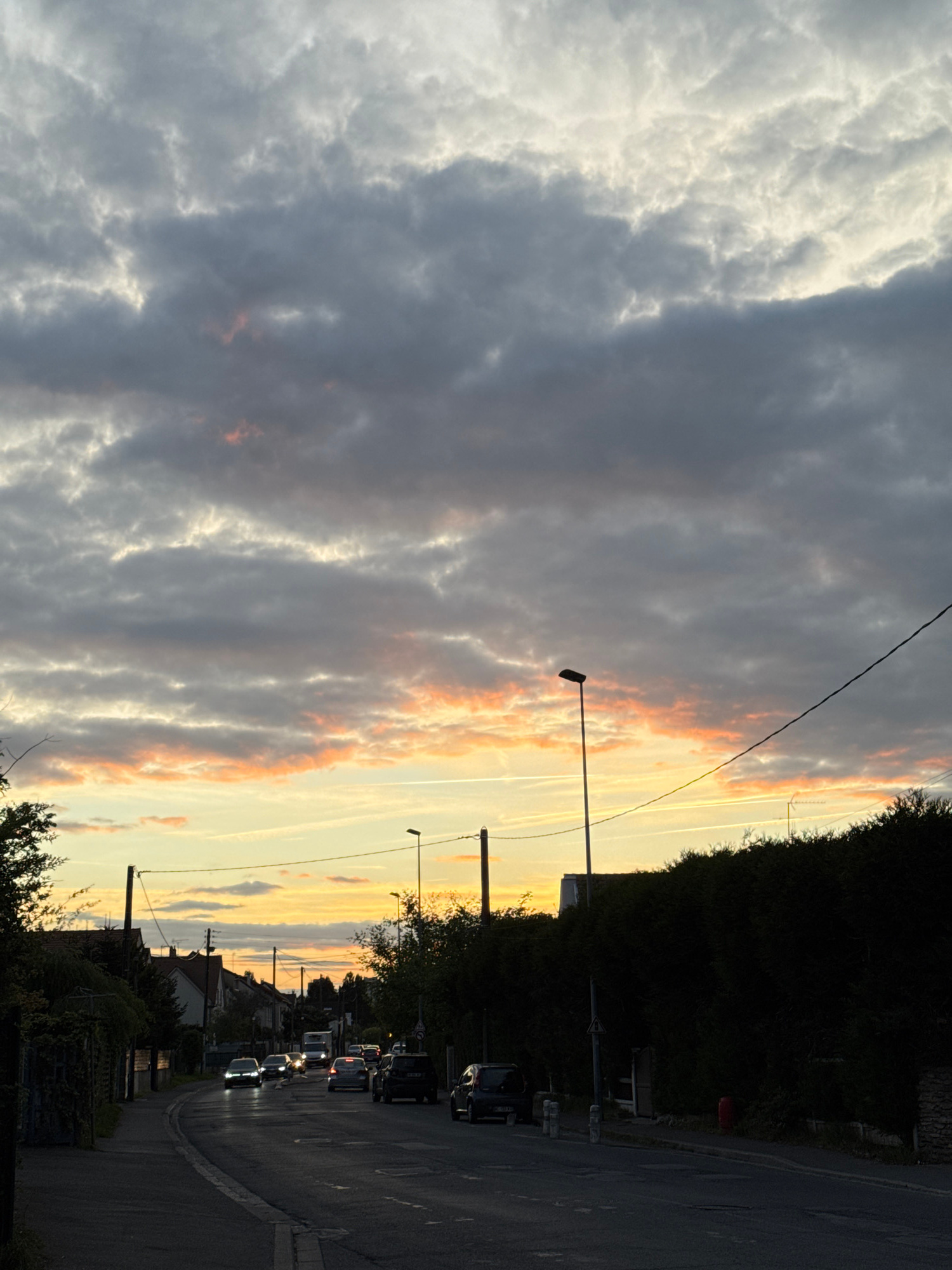 The image shows a street scene in Orsay, France, at dusk. The sky is filled with a dramatic cloudscape featuring hues of gray, white, and orange, suggesting a sunset. A street runs through the scene,…read more