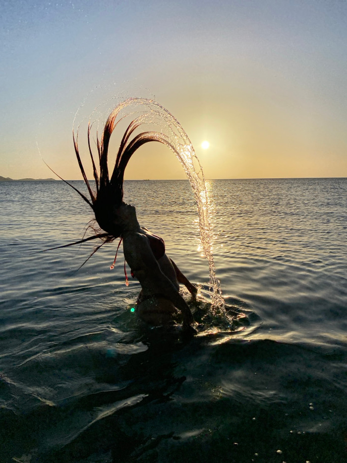 Against a setting sun, a woman in swimwear is silhouetted in the ocean. She's tossing her wet, dark hair, creating a sparkling arc of water droplets that reflects the sun's rays. The sea stretches out…read more