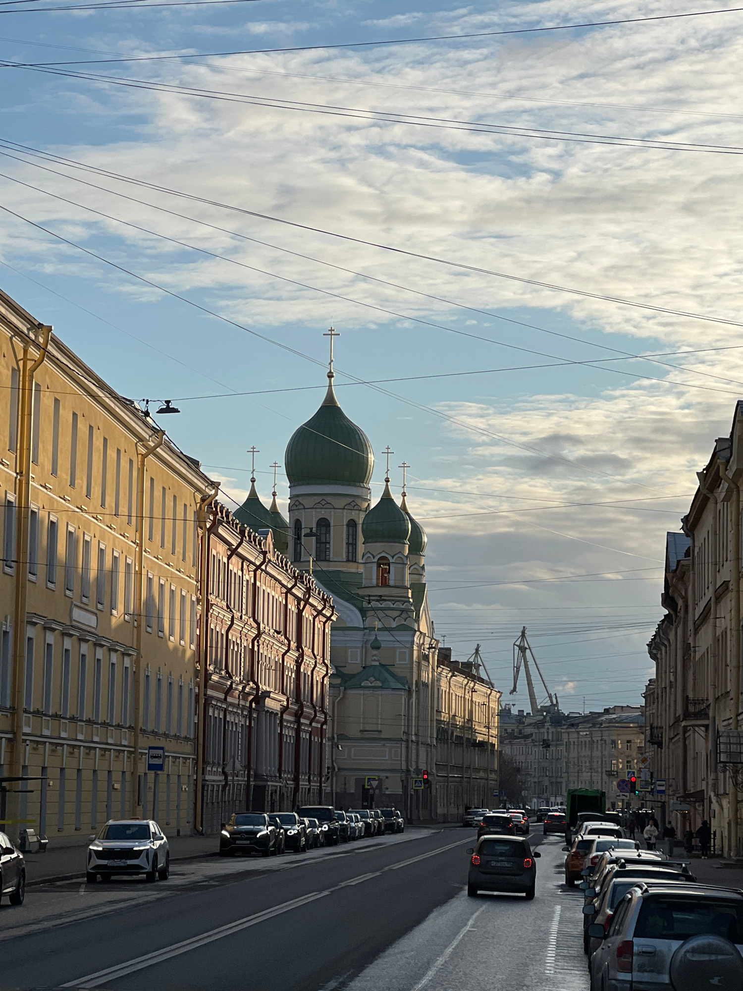 The image shows a street view in Saint Petersburg, Russia. A church with green domes and golden crosses stands out amidst the surrounding buildings. A row of buildings lines the street, with a color p…read more