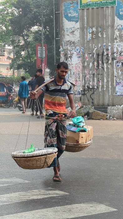 An urban street scene in Dhaka, Bangladesh is depicted in daylight. A man, approximately 30-40 years old, with dark hair and a beard, walks from right to left across an asphalt road, his gaze directed…read more