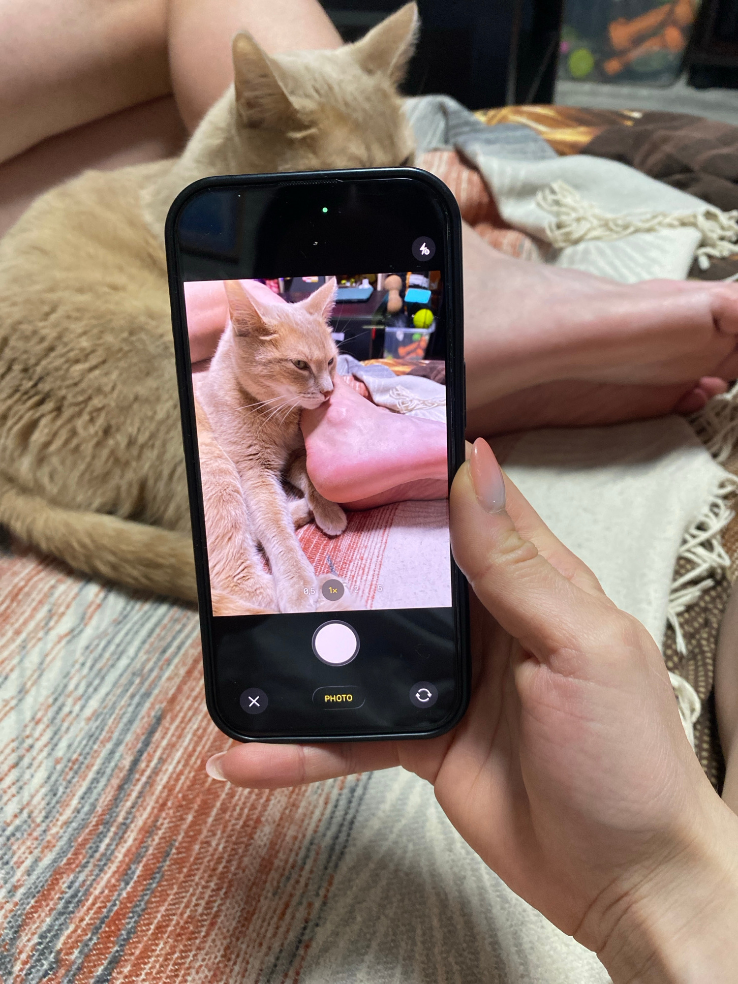 A person is taking a photo with a black iPhone of a cat licking their foot. The cat is light orange, and the foot is pale. The scene is taking place on a patterned blanket with shades of orange, brownβ¦read more