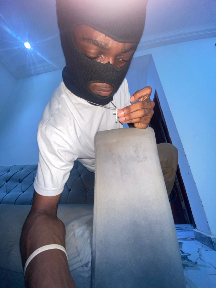 The scene depicts an individual, presumably an adult male, in an indoor setting within the city of Joma, Ghana. The person is wearing a black knitted balaclava, a plain white short-sleeved t-shirt, an…read more