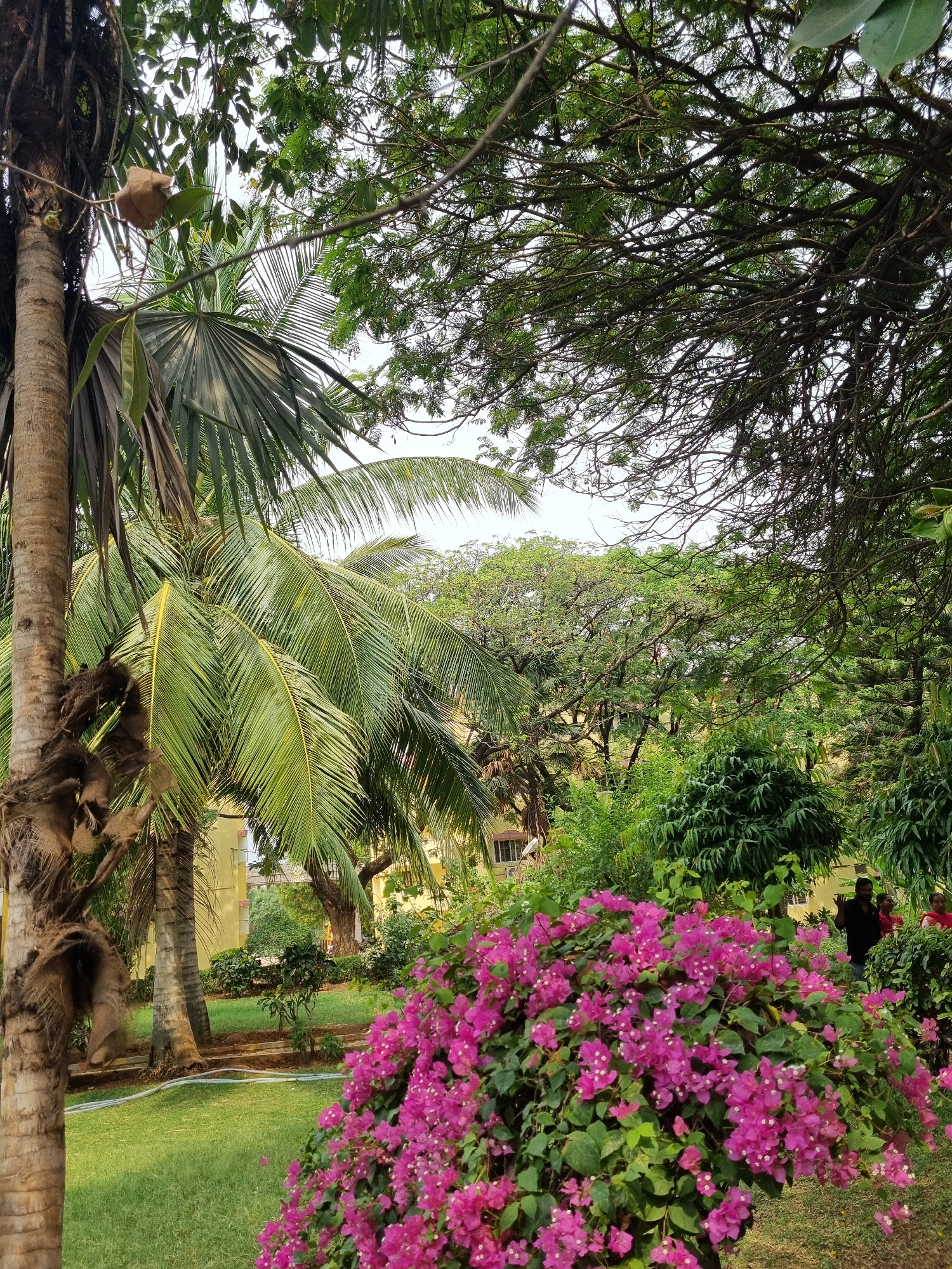 The image captures a tranquil outdoor scene in Puttaparthi, India. Predominantly visible are dense trees with intertwining branches framing the top of the shot, and a vibrant bougainvillea bush with b…read more