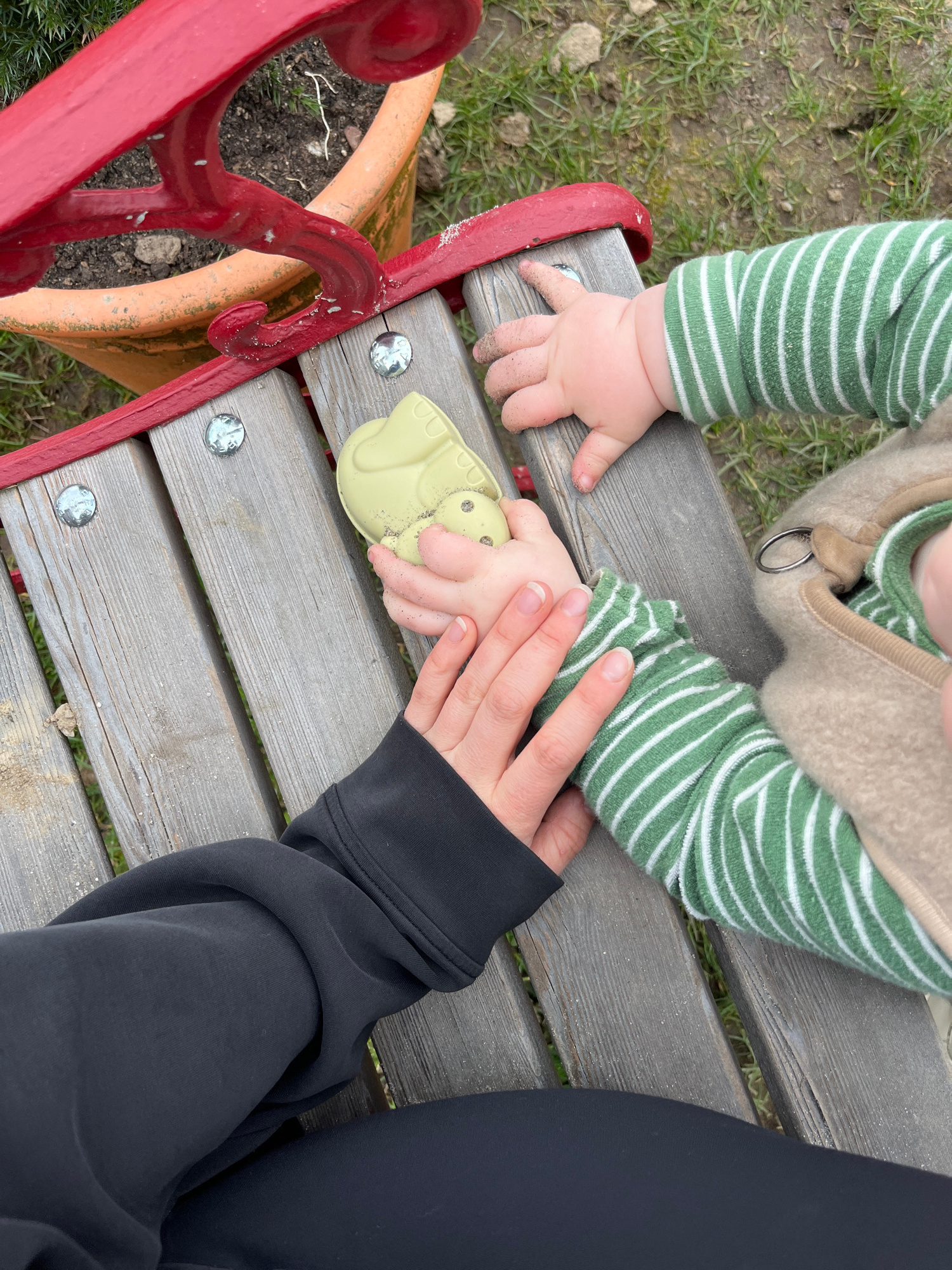 A high-angle shot captures a moment on a wooden bench in Gangloff, Germany. The scene centers around two hands, one belonging to an adult clad in a black long-sleeved garment, and the other a small ch…read more