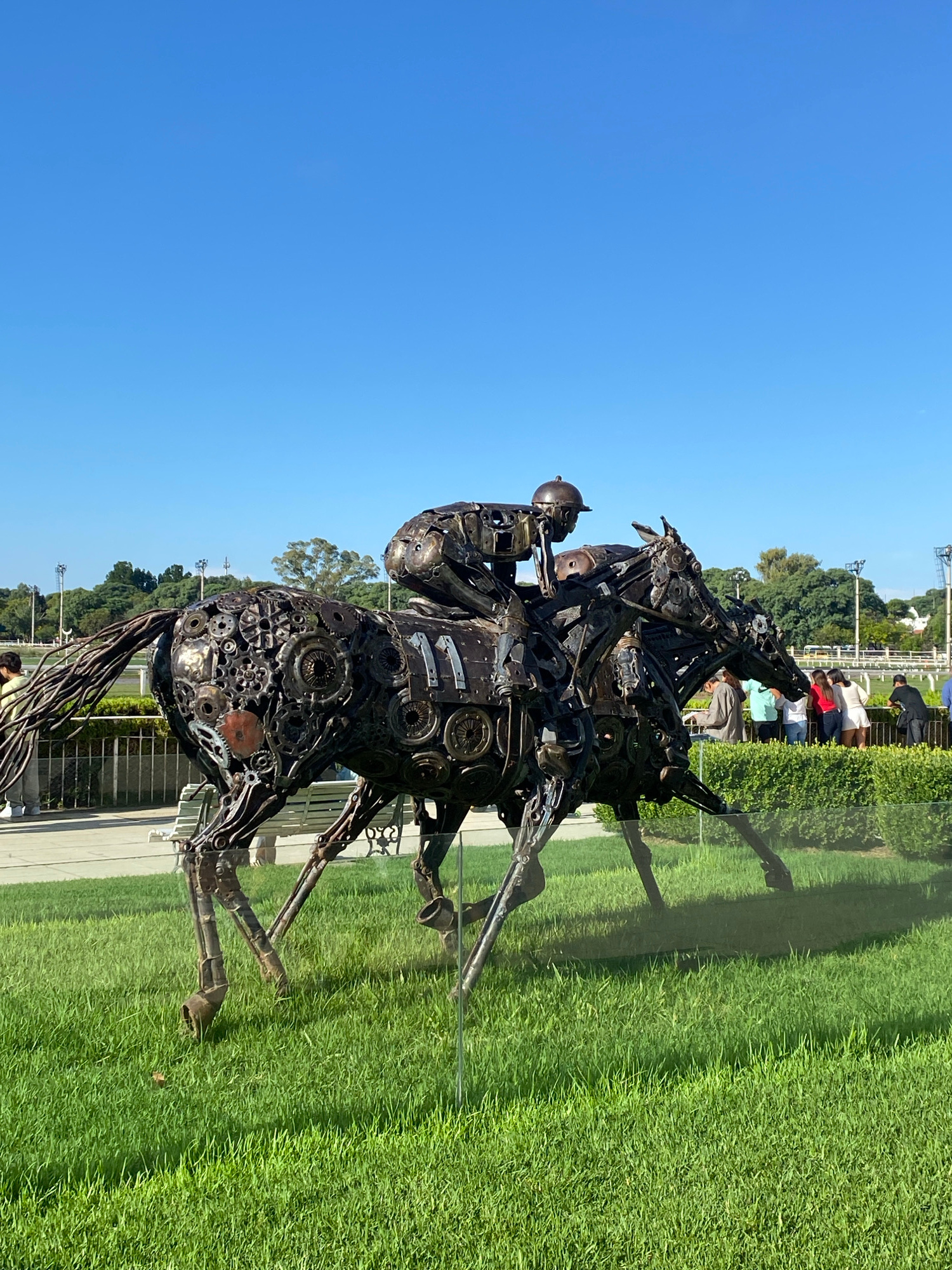 The image shows a metal sculpture of a jockey on a horse, located outdoors in Buenos Aires, Argentina. The sculpture is constructed from various mechanical parts, including gears and pipes. It stands…read more