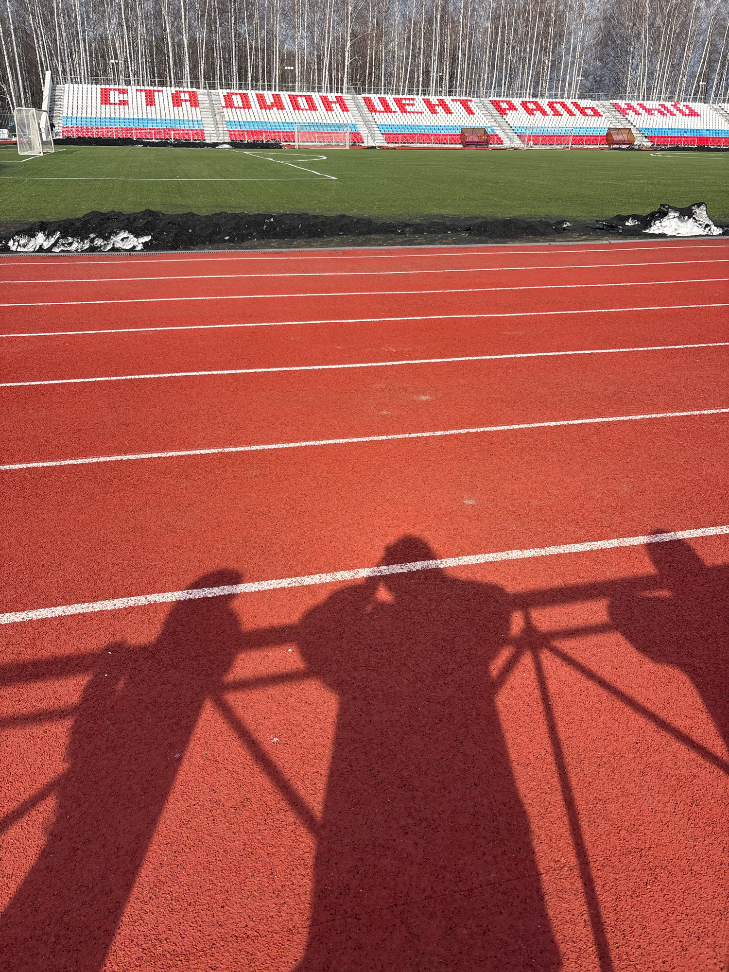 The image depicts an outdoor athletic track adjacent to a football field and stadium seating. The track, rendered in a reddish-brown color, is divided into lanes by white lines. The seating area featu…read more