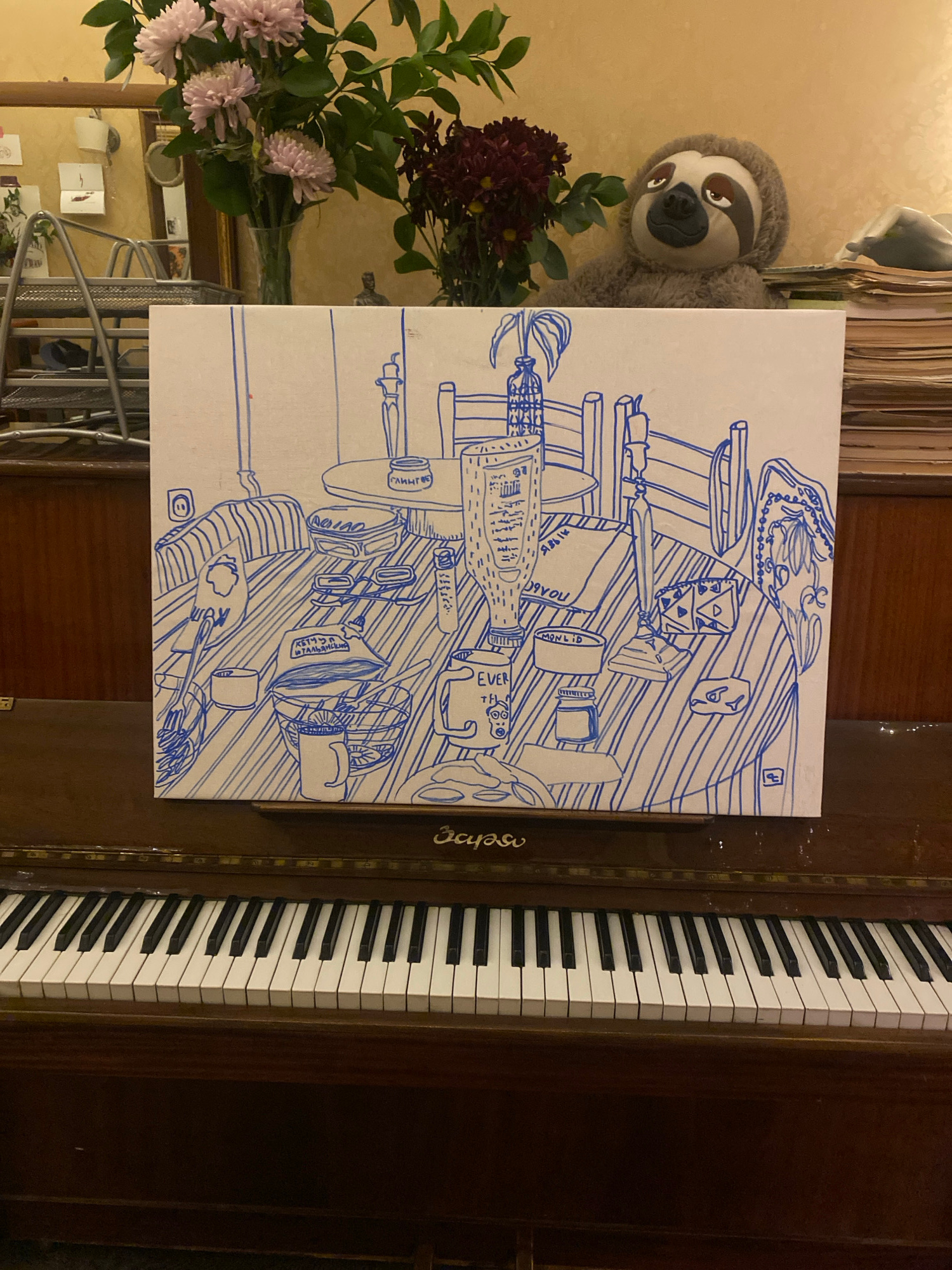 The image, rotated 90 degrees counter-clockwise, depicts an indoor scene, likely in Moscow, Russia. The central element is a white canvas featuring a detailed blue line drawing. This drawing illustrat…read more