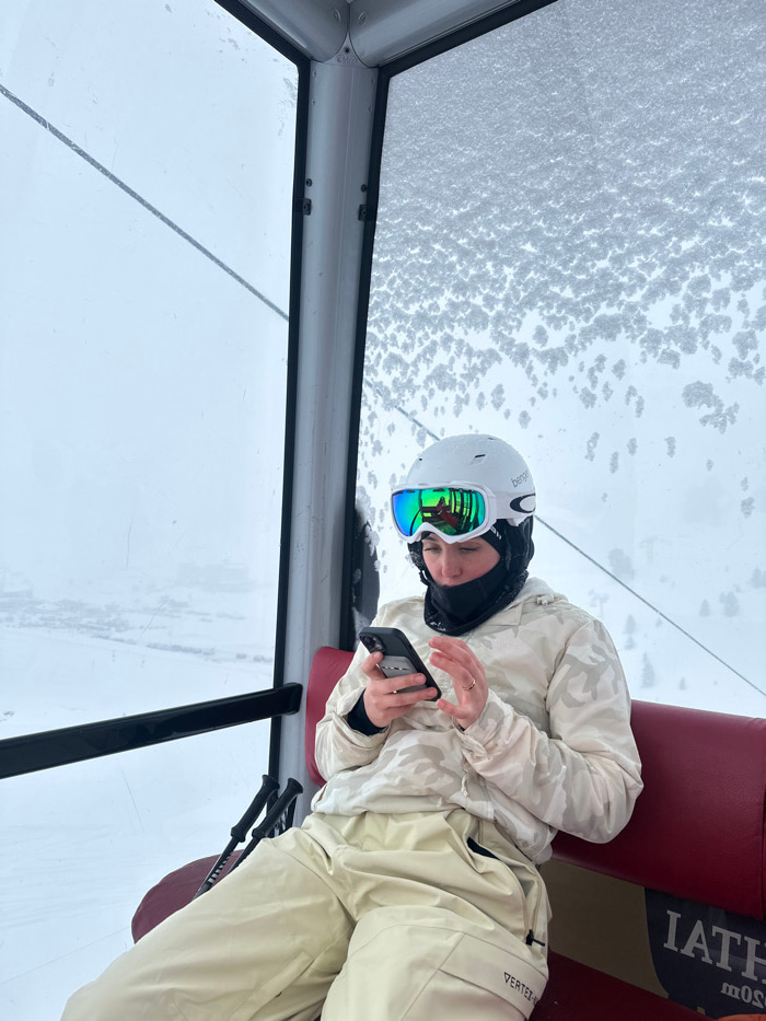 Inside a ski gondola cabin in Kühtai, Austria, a single individual is seated on a red upholstered bench. The person, appearing to be an adult, wears a white ski helmet with "bengar" text, reflective m…read more