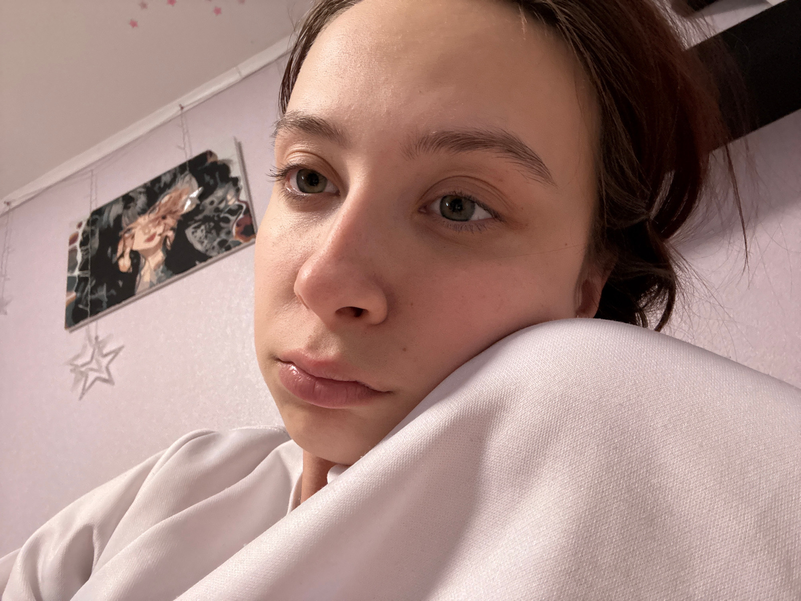 A close-up, inverted shot features a person with light skin, brown hair, and light green eyes. The individual is partially covered with a white garment, possibly a sweatshirt or blanket. The backgroun…read more