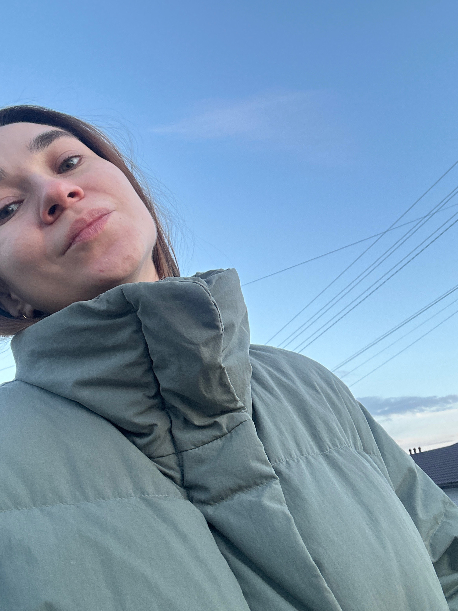 A woman in a green puffer jacket is positioned in the lower left of the frame, looking up at the camera. A clear blue sky fills the upper left portion of the image, with a set of power lines crossing…read more