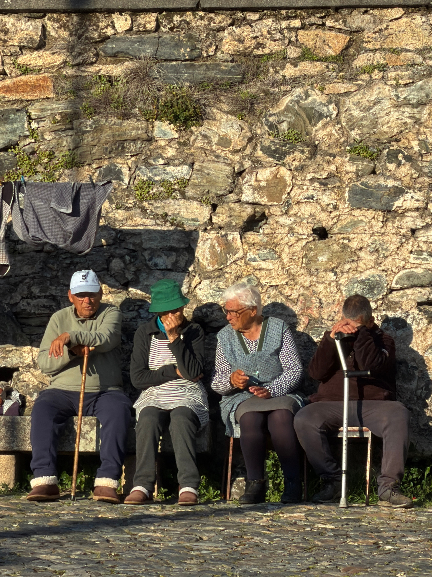 Four elderly individuals are observed seated outdoors on a sunlit cobblestone surface in Bragança, Portugal, positioned against a rough, multi-toned stone wall interspersed with sparse vegetation. Fr…read more
