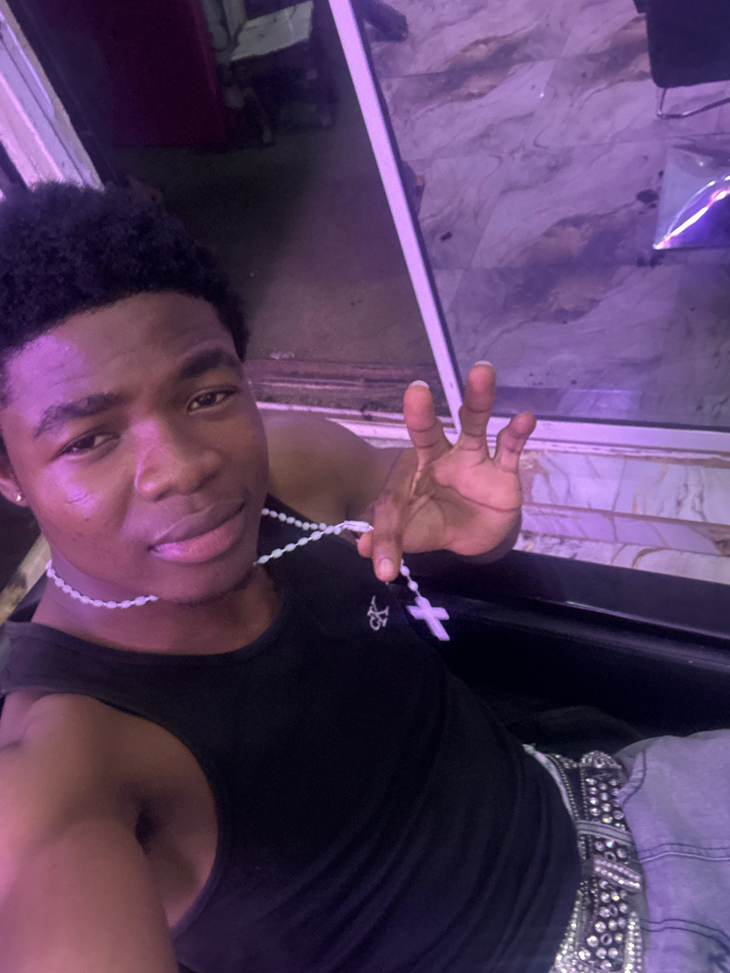 A portrait of a person with dark skin and short black hair, wearing a black tank top, a shiny silver belt, and a white beaded necklace. The person is holding the necklace up with their right hand. The…read more