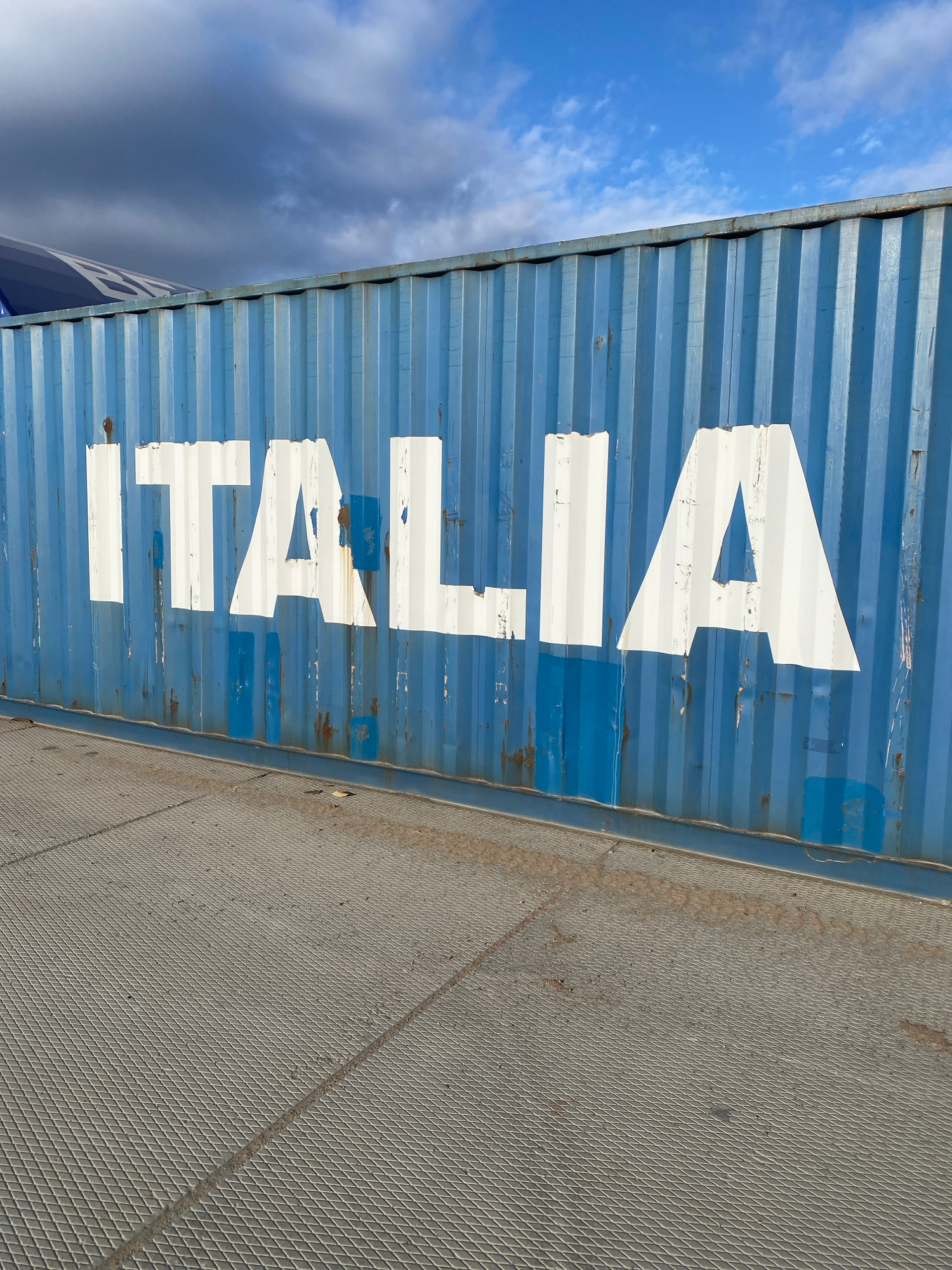 The image captures a slightly tilted, close-up view of a weathered blue shipping container in Luzhitsy, Russia. The container's corrugated metal surface is painted a faded blue, with significant chipp…read more
