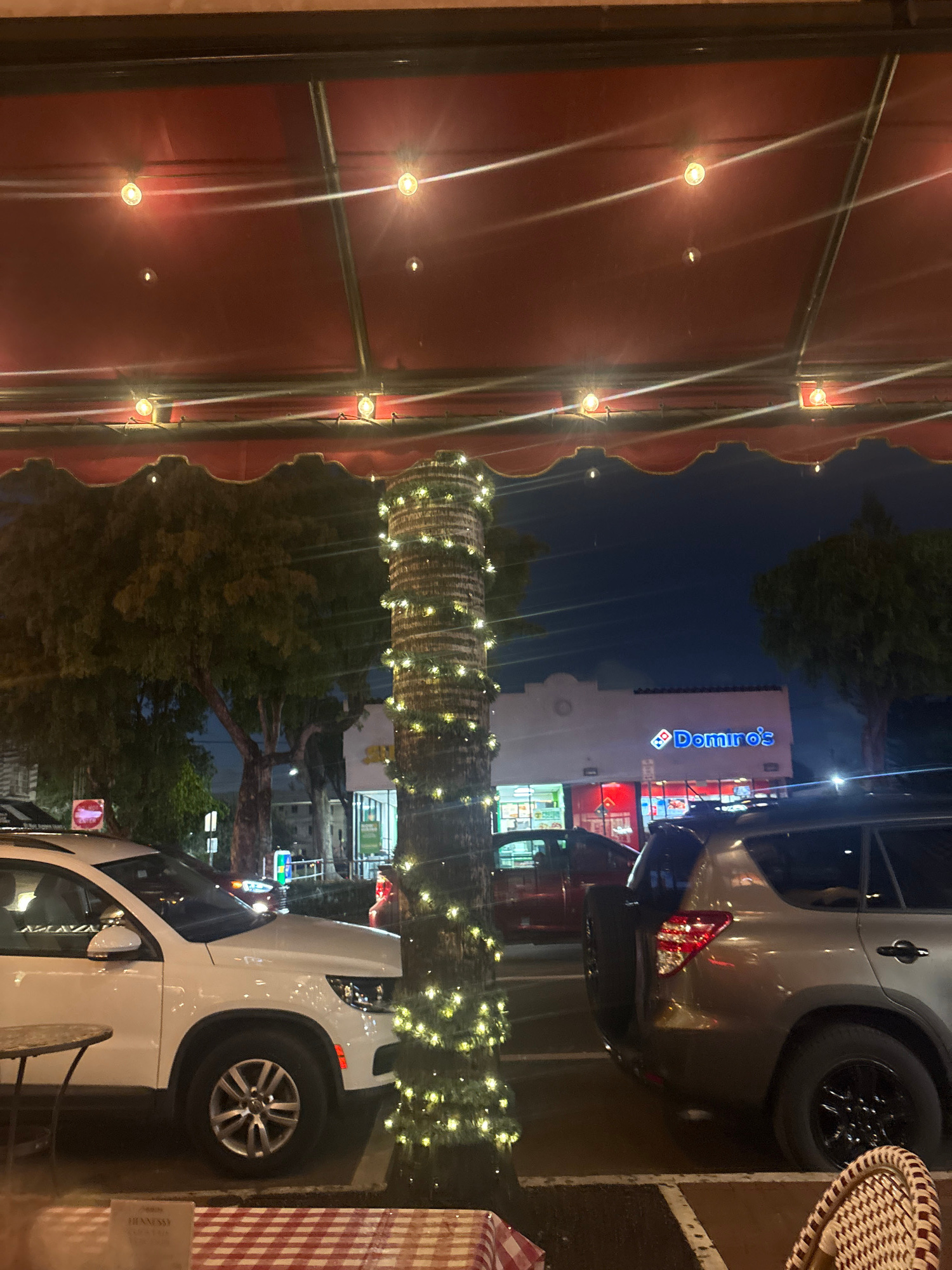 The image shows an outdoor scene at night, possibly a restaurant or café, in what is implied to be Miami, United States of America. The scene is framed by a red awning adorned with lights. Foreground…read more