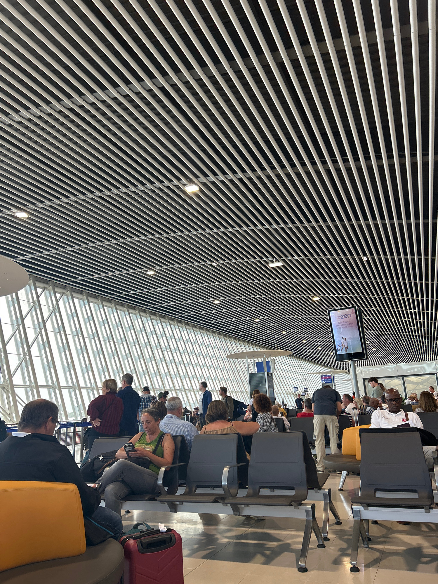 The image depicts the departure hall of the Guadeloupe – Pôle Caraïbes Airport (PTP) in Les Abymes, France. Rows of gray and yellow airport seats are occupied by waiting passengers. A digital display…read more