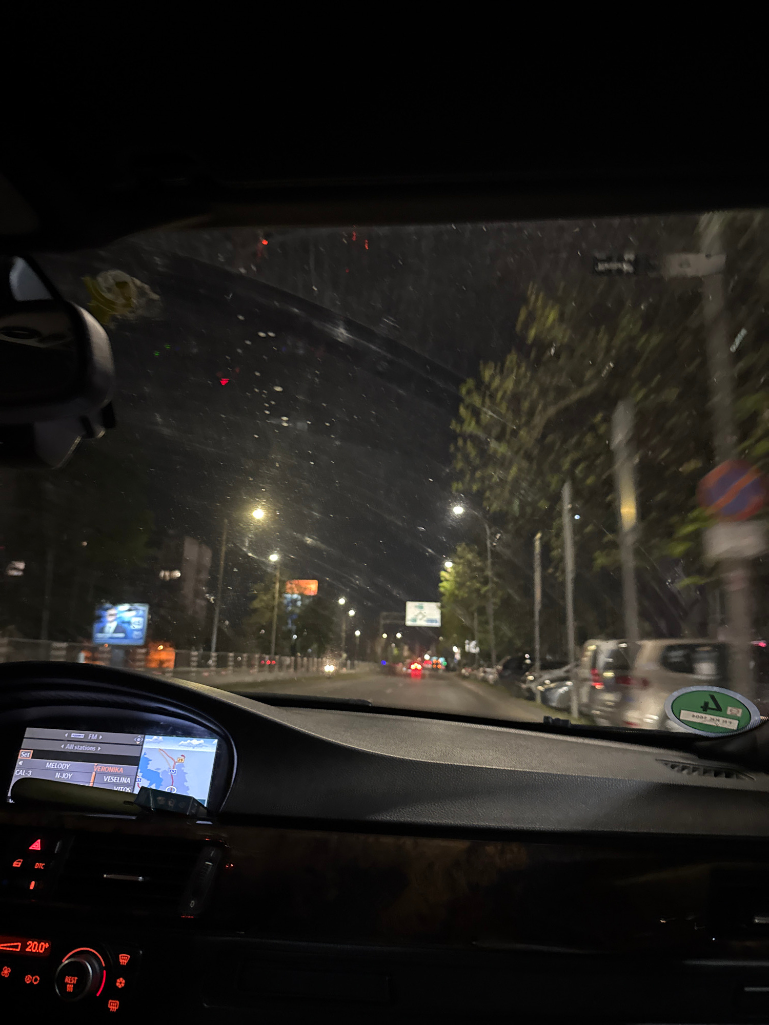 The media file presents a first-person perspective from inside a car, looking out through the windshield at night. The scene captures a city street illuminated by numerous streetlights and distant veh…read more