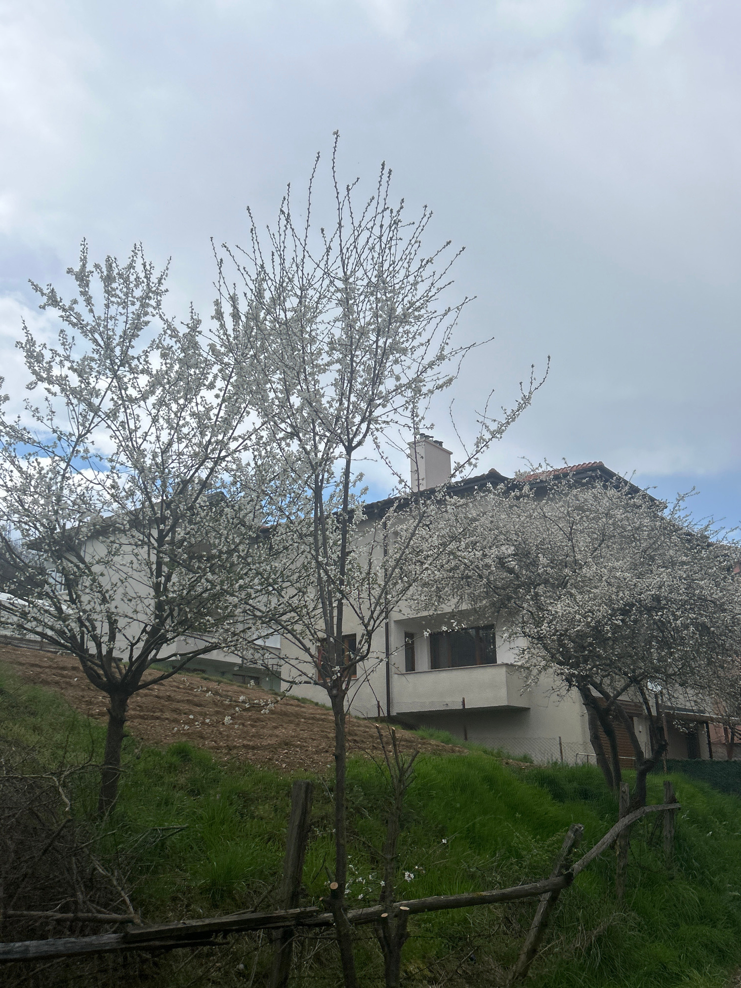 The image shows a residential scene in Zlatograd, Bulgaria. A white two-story building with a red-tiled roof is partially obscured by flowering trees. The trees have white blossoms, suggesting springtime. One tree is in the foreground, fully visible. The building has at least one visible window. The ground slopes upward towards the building, with patches of green grass and brown earth. In the foreground, a wooden fence-like structure is present, partially obscuring the view. The sky is overcast with a mix of blue and gray clouds. No people are visible in the frame. | Open Wire