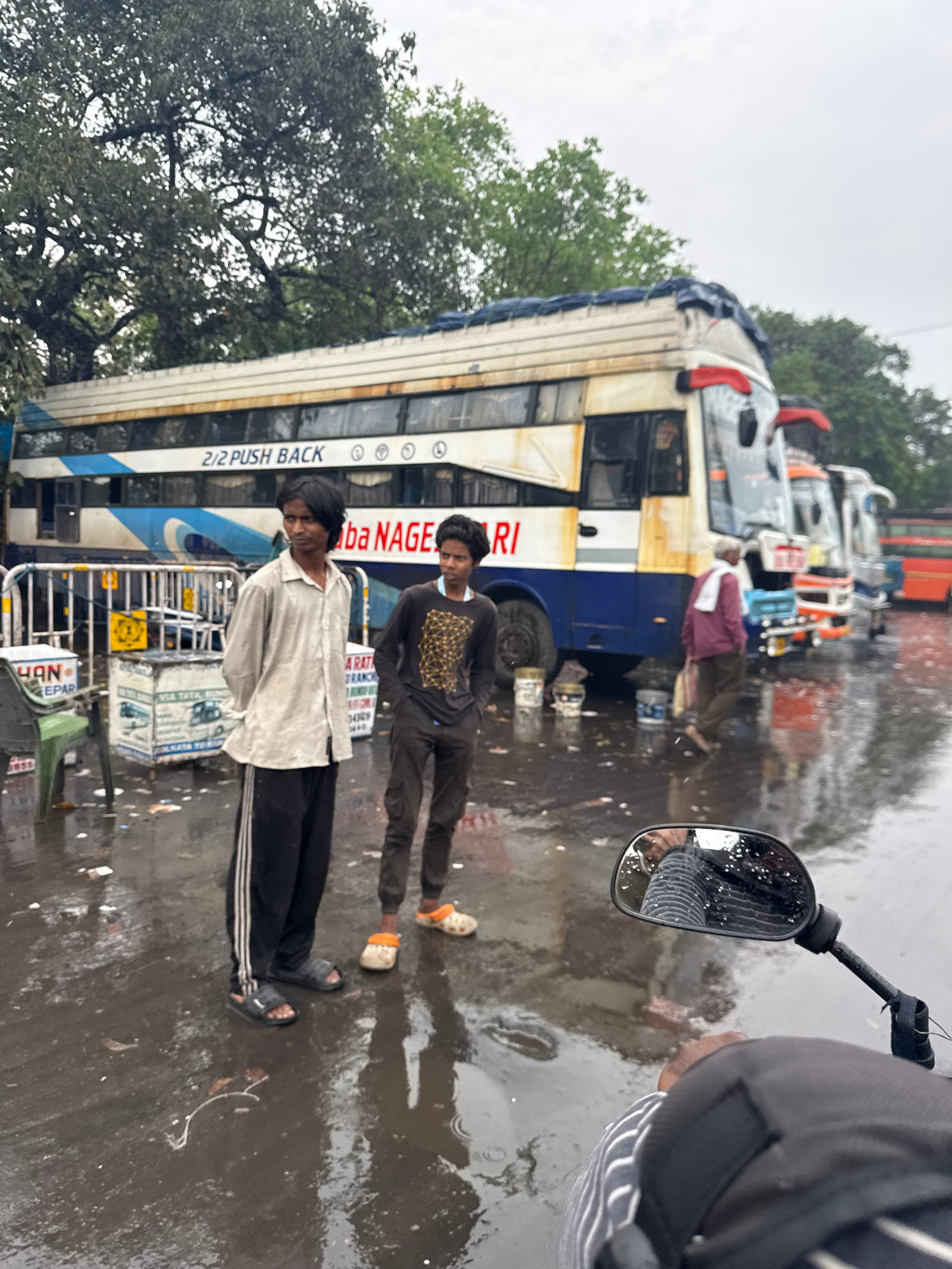 The image shows an outdoor scene in Kolkata, India, during or just after rainfall. The ground is wet and reflective. In the center-left of the frame, there's a partially visible bus with faded white a…read more