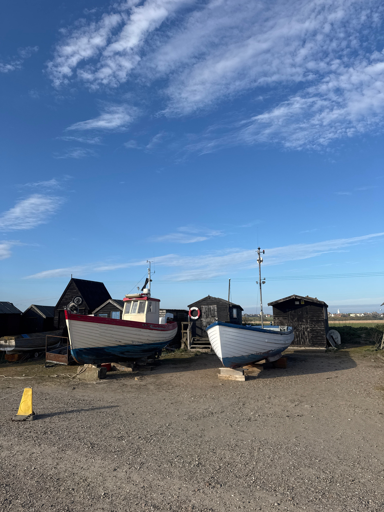 The image depicts a coastal scene, likely in East Suffolk, United Kingdom, given the style of boats and huts. Two boats are grounded on a pebbled/gravelly surface, positioned in front of small, weathe…read more