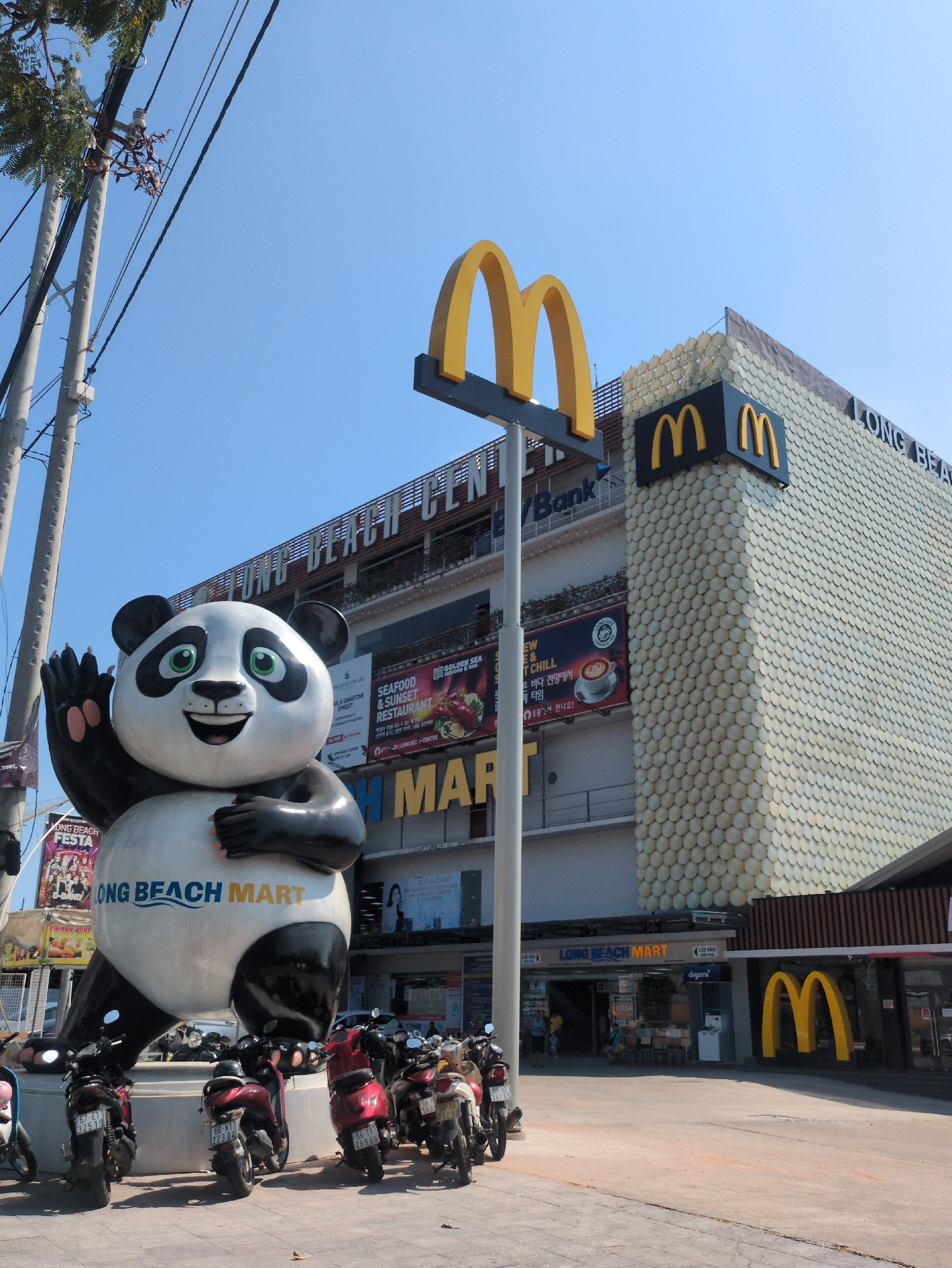A scene in Phú Quốc, Vietnam, shows a McDonald's establishment with unique architecture. The building features a façade adorned with numerous white discs, resembling scales. The McDonald's logo is dis…read more