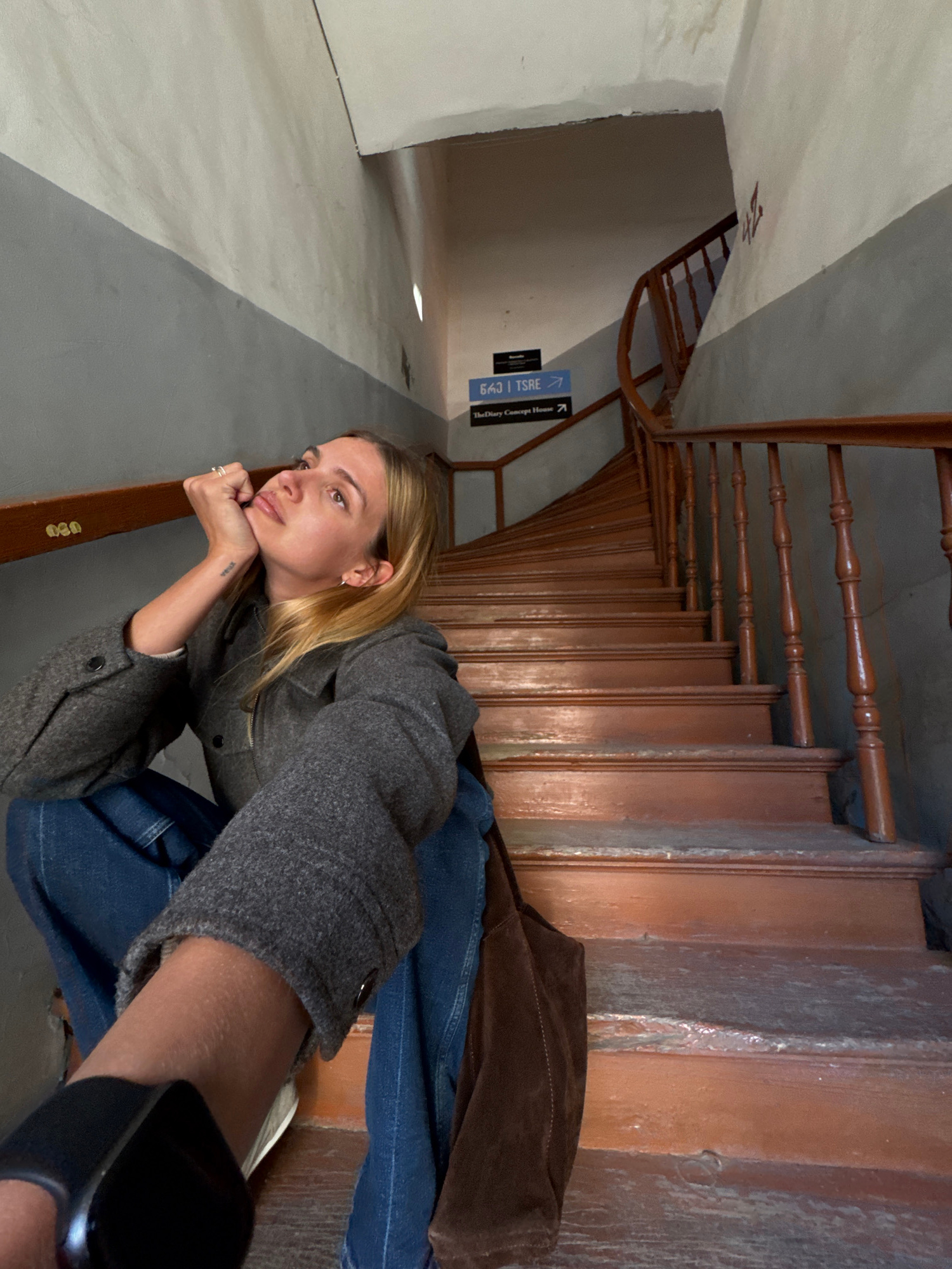 A blonde-haired woman is seated on a wooden staircase in the city of Tbilisi, Georgia. She is wearing blue jeans and a gray jacket, resting her head on her hand, with a tattoo visible on her forearm. The staircase is made of dark-stained wood, extending downwards in a winding fashion. A brown jacket or coat is draped over a portion of the steps. A hallway with white and gray walls is adjacent to the staircase. A directional sign is visible on the wall, indicating "The Diary Concept House". The image appears to be taken at a rotated angle. An electronic device, possibly a smart watch, is on the person's wrist near the bottom right corner of the image. | Open Wire