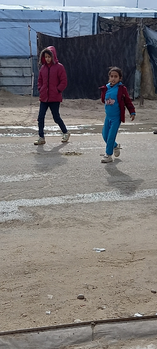 The image shows two female individuals, appearing to be children or adolescents, walking from left to right across an outdoor area in Khan Yunis, Palestinian Territory. The individual on the left wear…read more