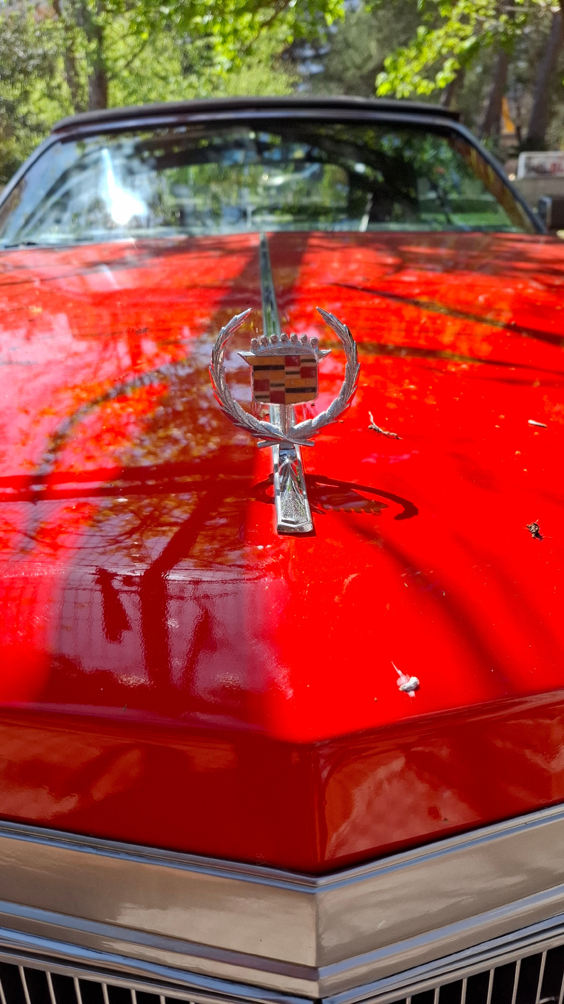 A close-up, outdoor shot of the hood and emblem of a red Cadillac. The emblem is prominently displayed, reflecting light and the surrounding environment. Small debris is scattered on the hood's surfac…read more