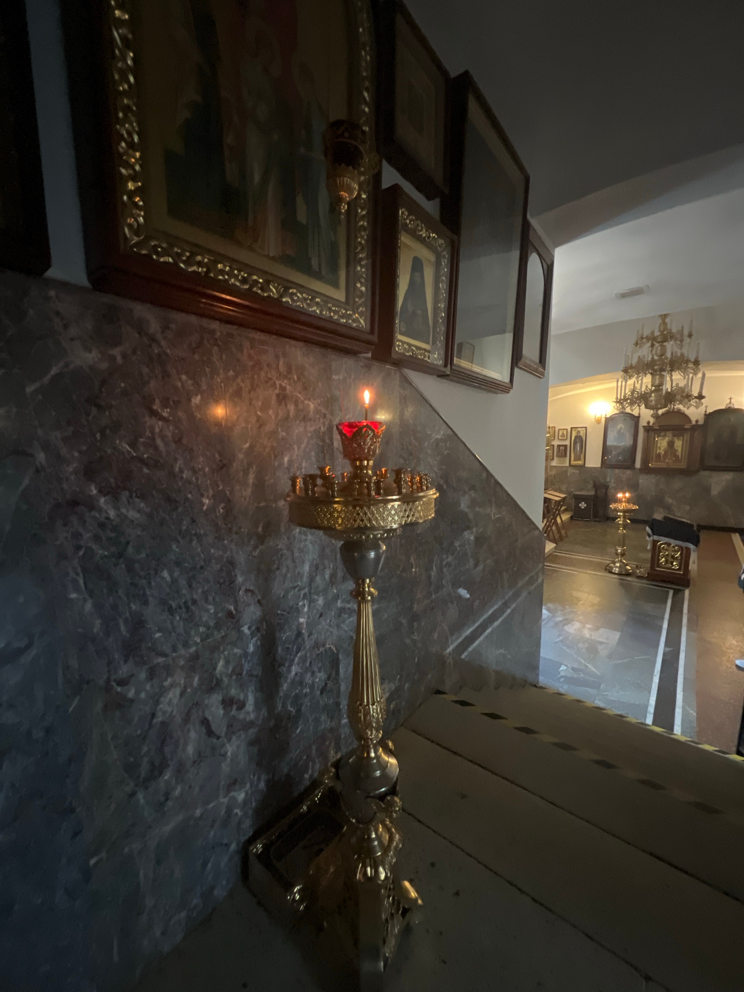 The image shows the interior of a church in Minsk, Belarus. It is taken from a low angle, looking up and across a marble surface on which a lit golden candle stand rests. Adjacent to the candle stand,…read more
