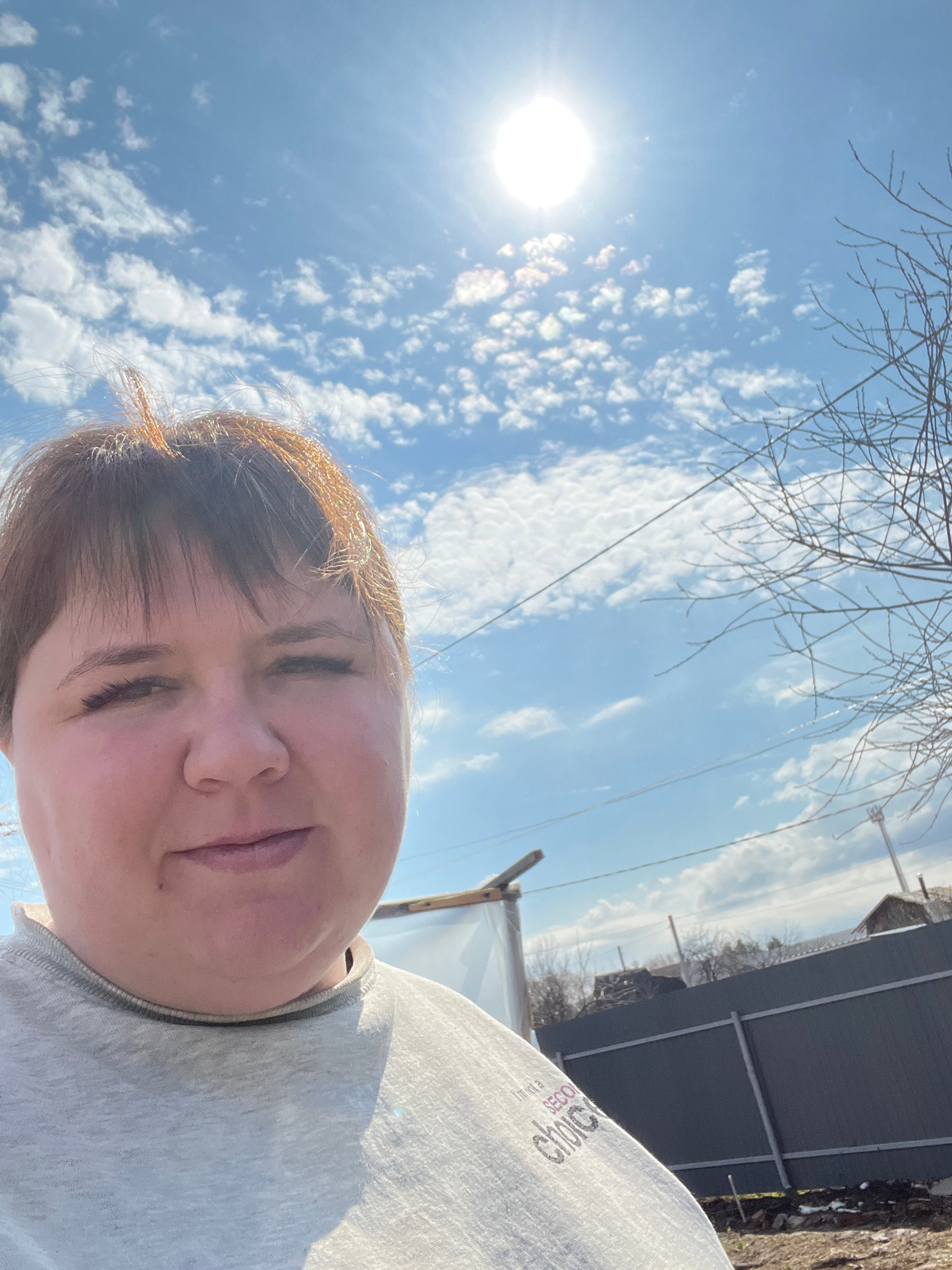 This outdoor selfie, rotated 90 degrees counter-clockwise, features a woman in the foreground against a bright sky. The woman, with brown hair, appears in the lower-right portion of the frame (when up…read more