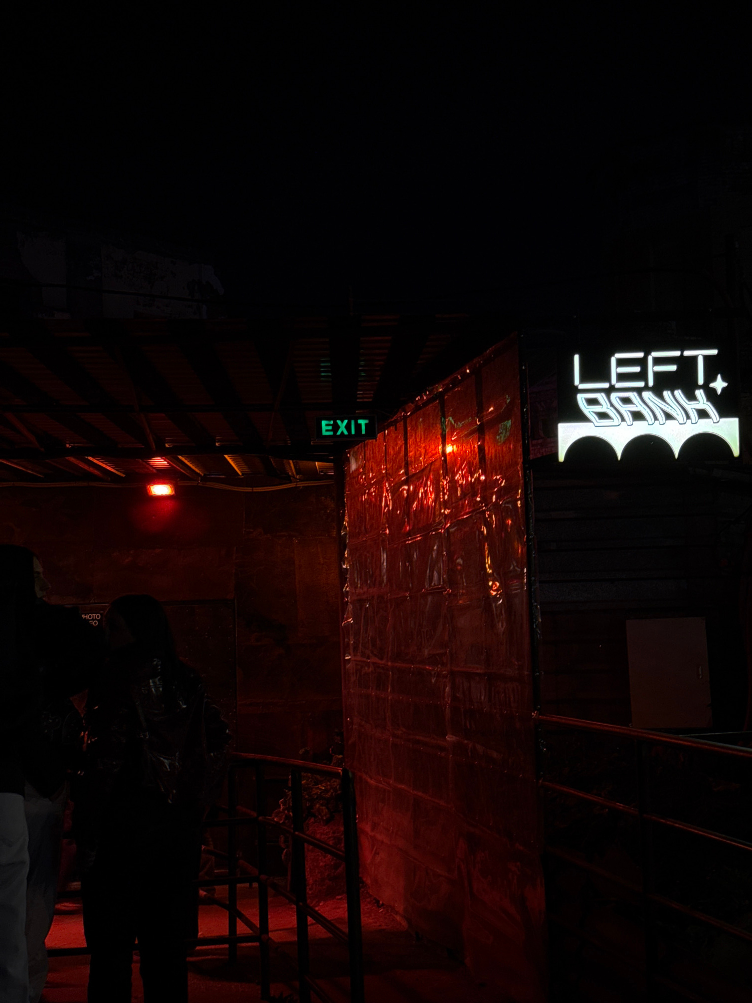 The image depicts the interior of the "Left Bank" nightclub in Tbilisi, Georgia. A neon sign reading "LEFT BANK" is visible at the top, along with an exit sign in green lettering. The walls and ceilin…read more
