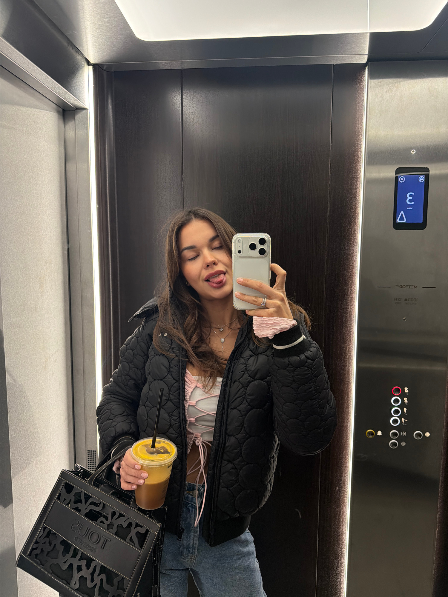The image is a selfie taken by a young woman inside an elevator. She is wearing a black puffer jacket, a light-colored top with pink strings, and blue jeans. She's holding a drink in a plastic cup wit…read more